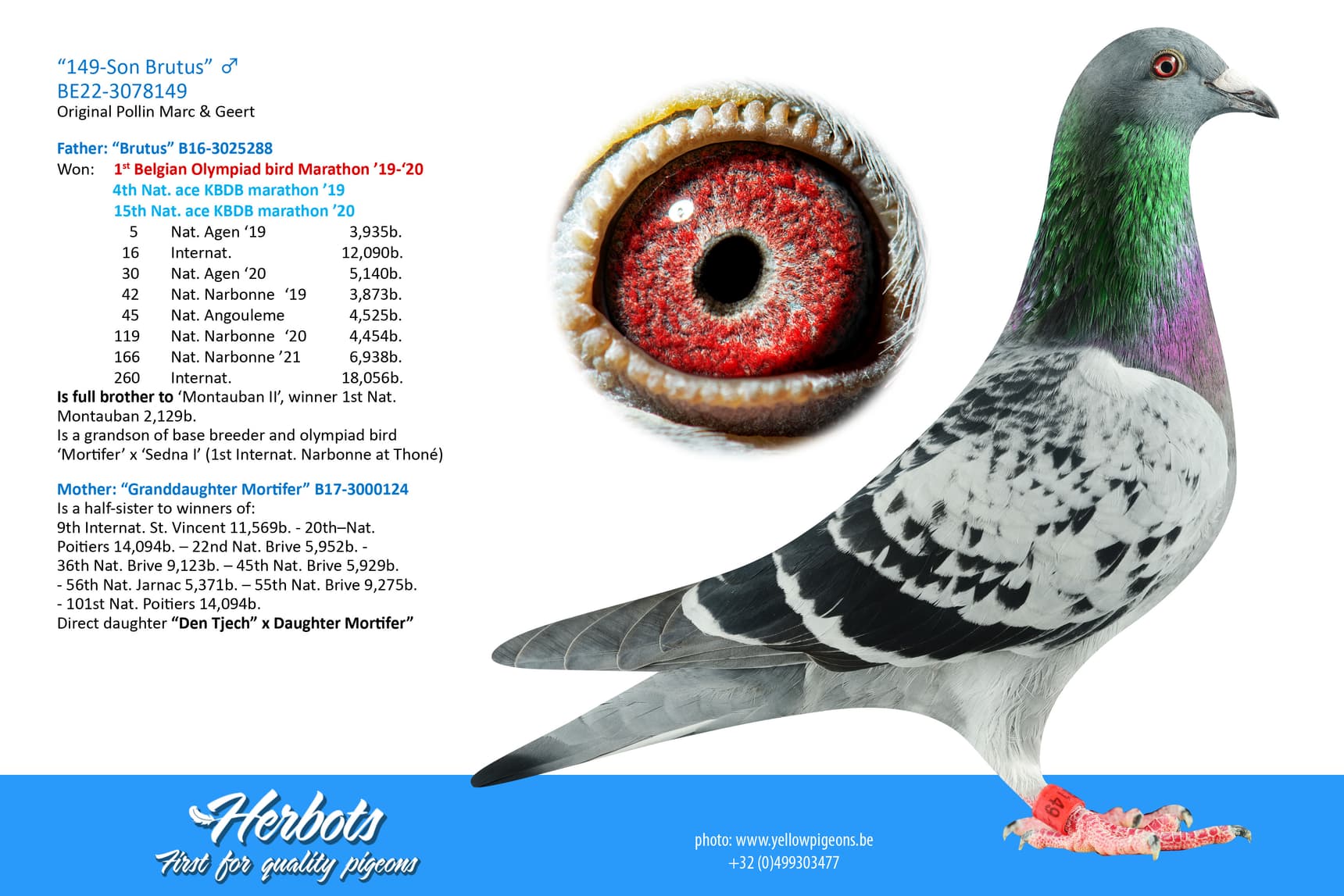 Performing at a high level, it is simply baked into the DNA of the Pollin pigeons. Yet another proof is provided by "Brutus", a full brother of "Montauban II" became 1st Olympiad pigeon Marathon 2022 and also shone with glorious titles such as 4th National ace pigeon KBDB marathon '19 - 15th National ace pigeon KBDB marathon '20