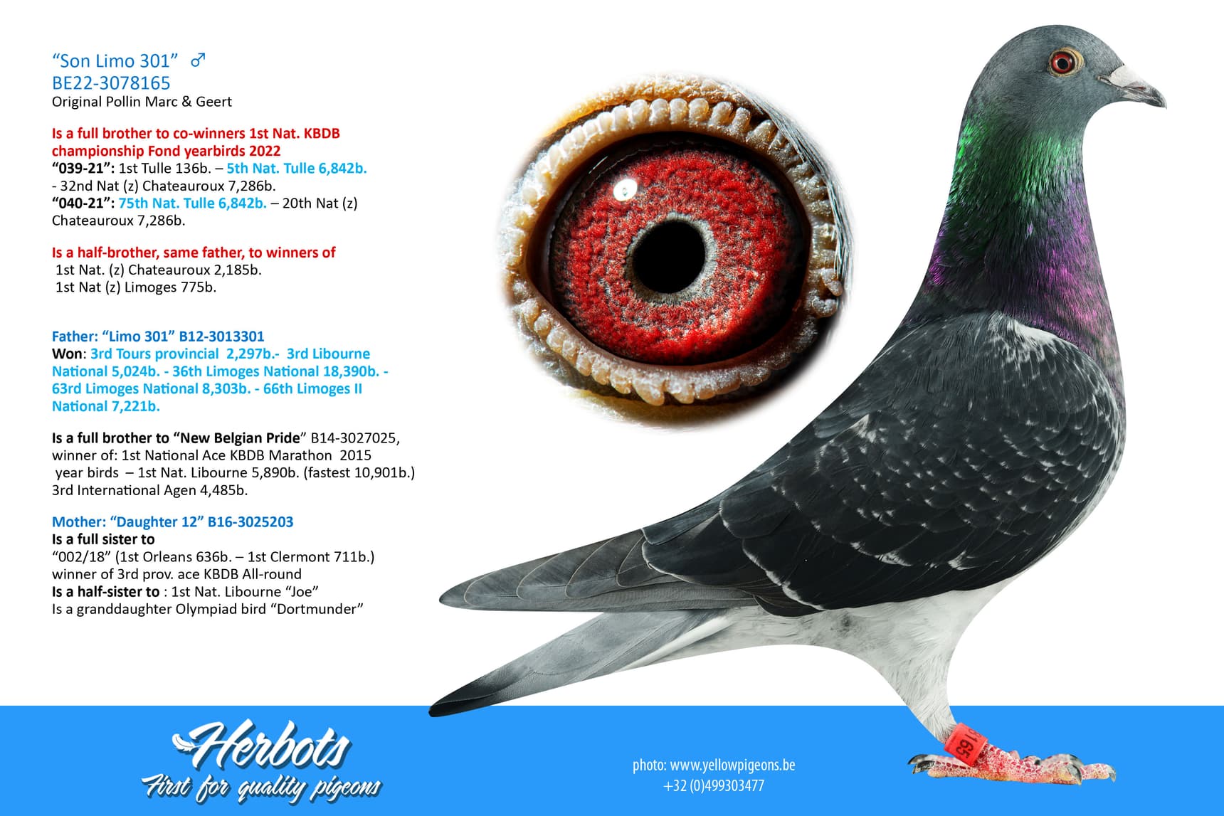 Father: B13-3013025 - "Son Nai 025": 9th Internat. St. Vincent 11,569d. - 20th Nat. Poitiers 14,094b. - 32nd Nat. Brive 5,952b.