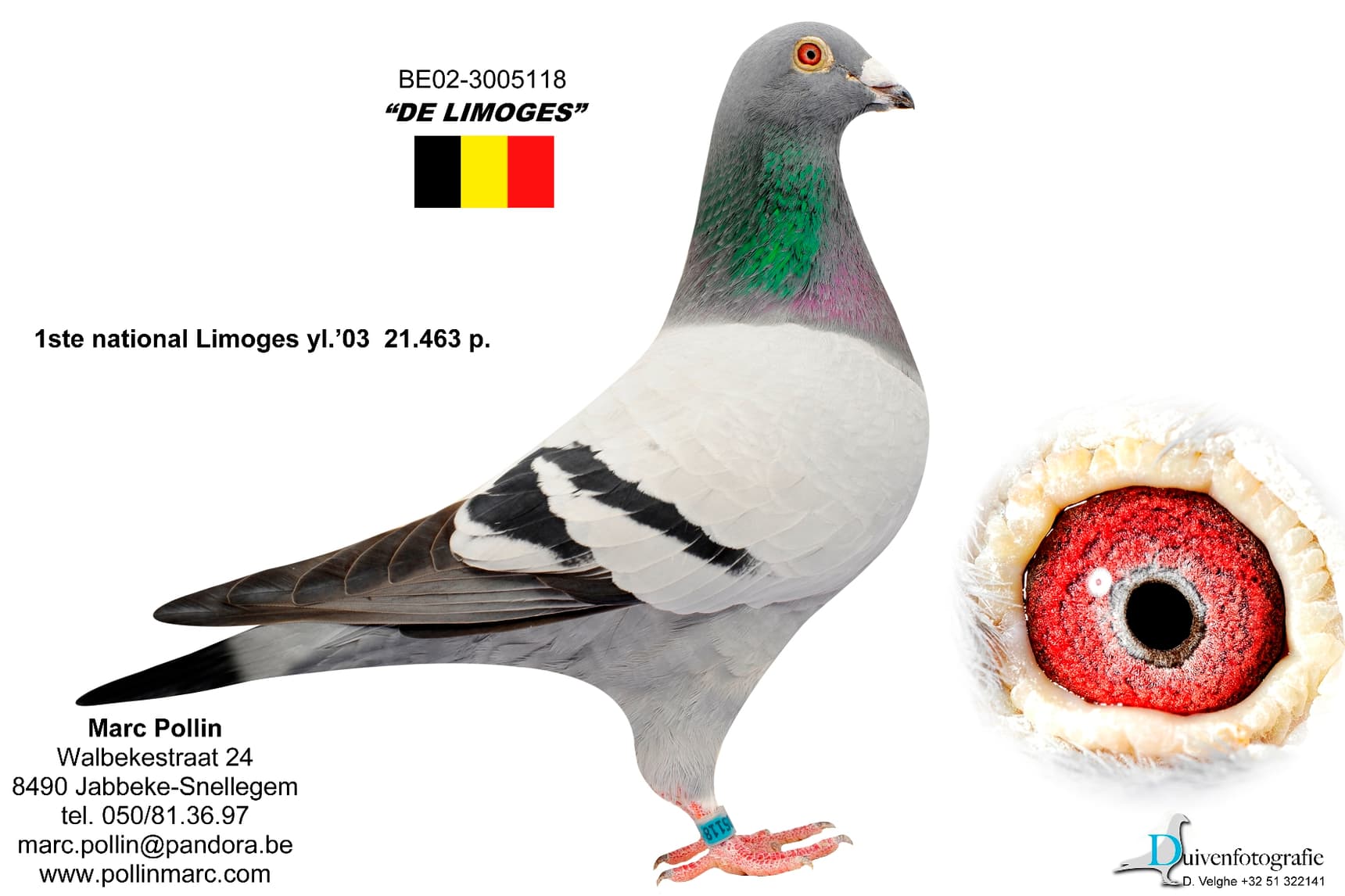 Limoges National for yearlings. The early 2000s were the classic for yearlings. Back then, yearlings had a slightly "easier" schedule than they do now, and Limoges was the final exam for all yearling long-distance pigeons. This race wasn't about being allowed to perform, but about having to perform. Limoges was the "selection race." For this reason, Limoges yearlings always attracted a large number of pigeons, and in 2003, no fewer than 21,463 yearlings were at the release site. Released at 6:50 a.m., "B02-3005118" (later renamed "De Limoges") showed everyone with an average speed of 1,141.86 m/m. "De Limoges"... a beautiful blue cock... and a cross between the top lines of "De Vooruit" and "De Perpignan."