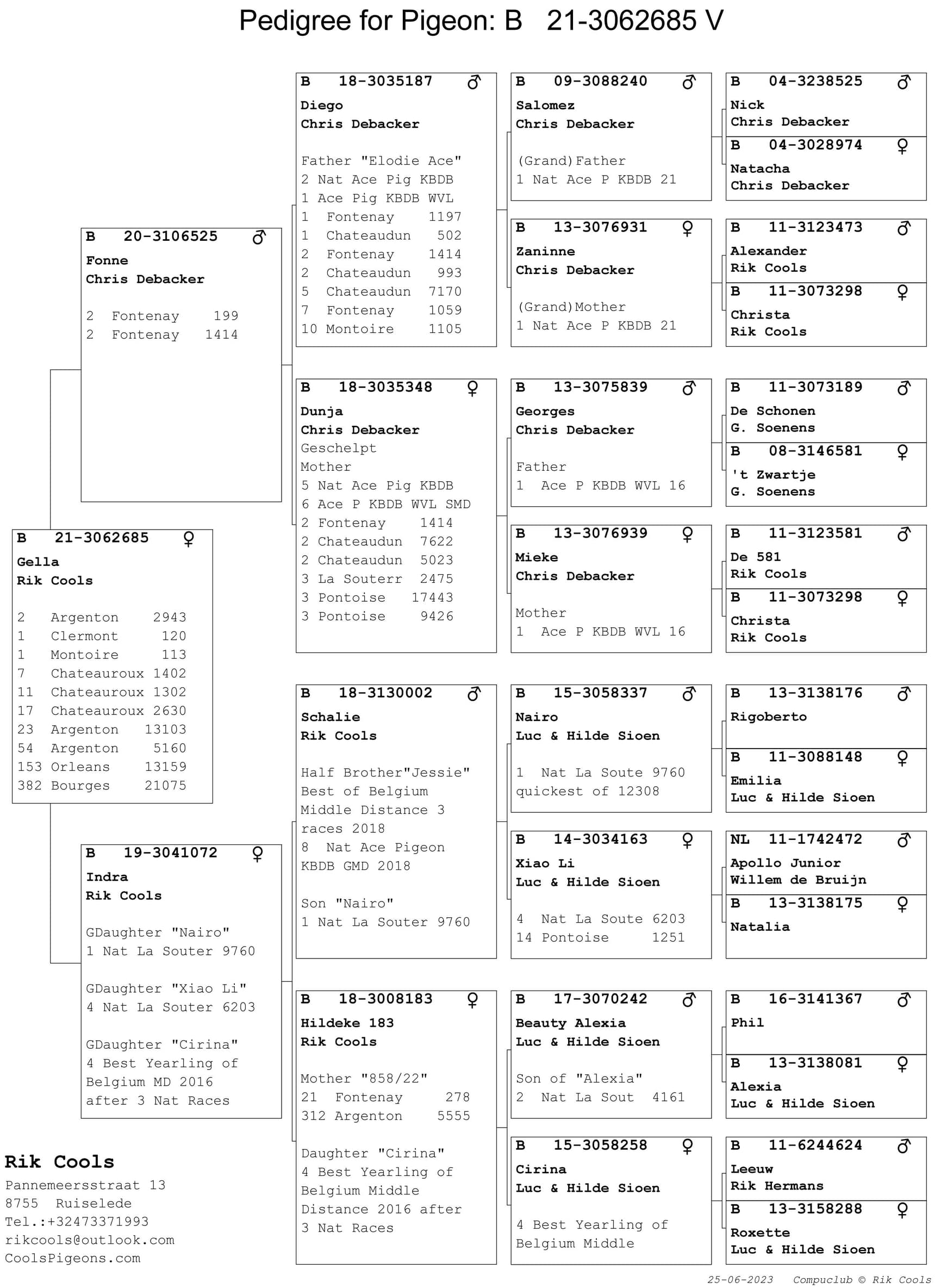 Gella BE21-3062685 : A hen that can typically serve as an example of the cooperation between Rik and Chris. The father is a cock from Chris with the best of the best of this loft in his blood. The mother is a hen from Rik and can mainly be traced back to the top loft Luc & Hilde Sioen. Luc & Hilde are the specialists with hens on the heavy middle distance, with many a strong reference on top.  A very nice pairing that led top very strong results.