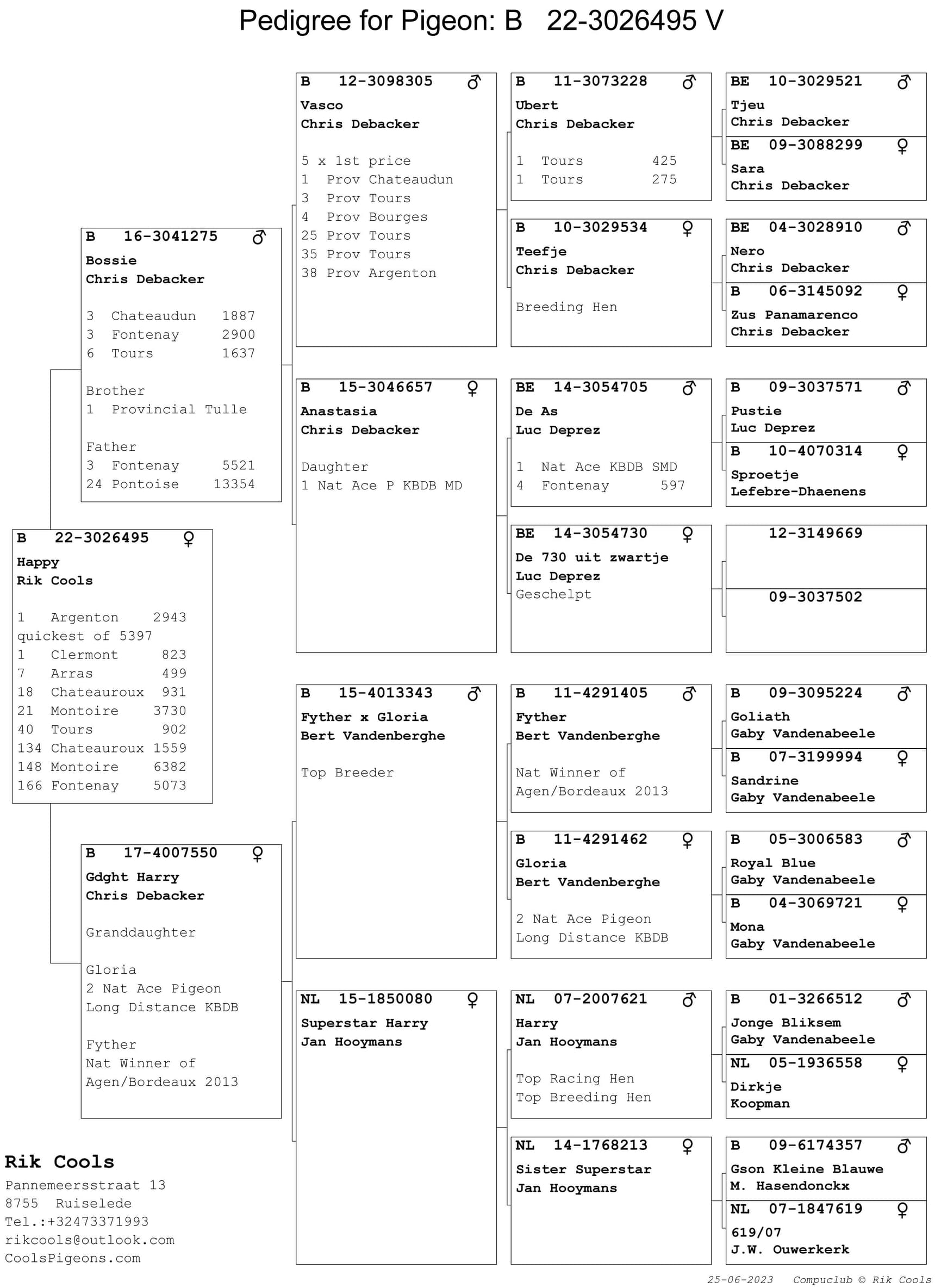 Happy BE22-3026495 : a hen bred by Chris Debacker. It was no surprise that she could do this as she already won 1st Clermont, top Chateauroux etc....  On her father's side, she comes from Chris' own breeding lines. Along mothers side she is a product of the Fyther-Gloria line of Bert Vanden Berghe coupled with the best of Jan Hooijmans. A toppedigree that also lives up to it in results.
