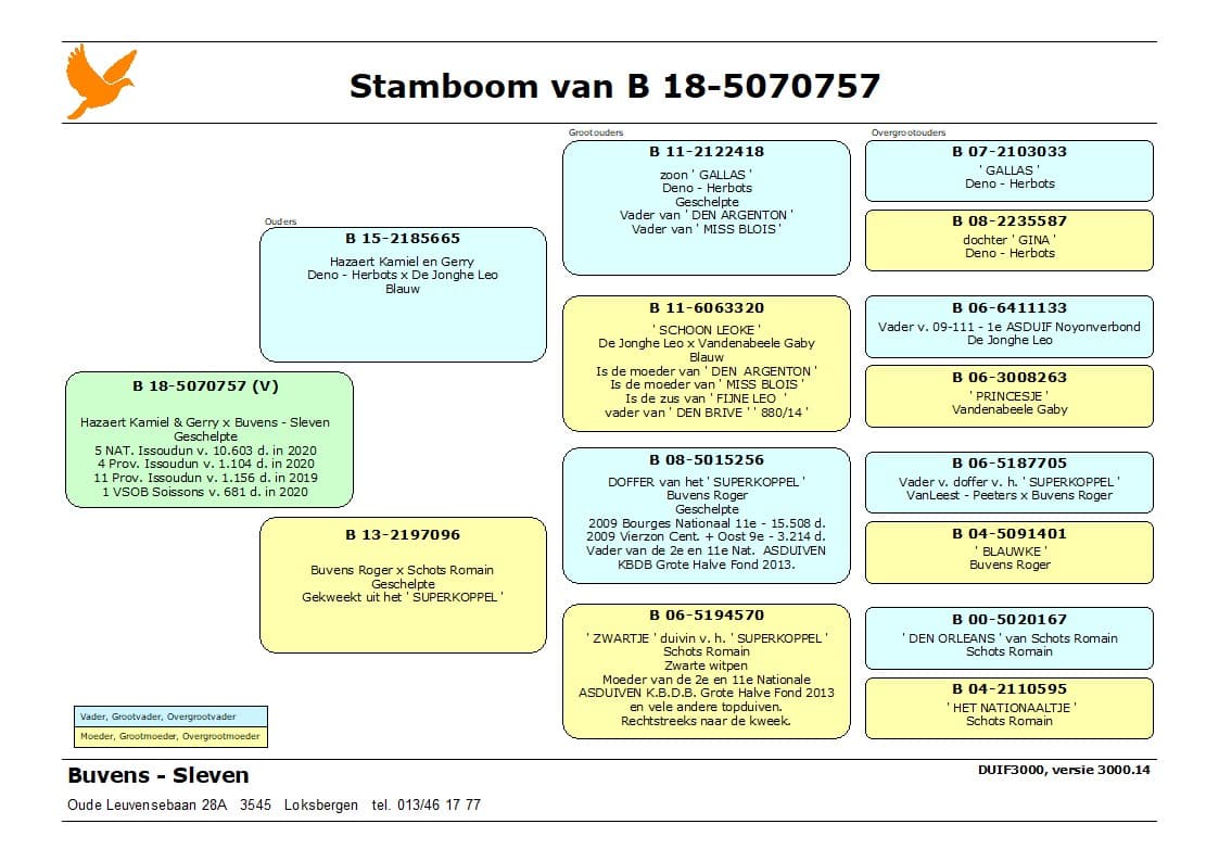 On the national race out of Issoudun one fancier succeeded to get 2 pigeons within the top 5 National. This was Roger Buvens out of Loksbergen, the national top colony that has been found the past years on a very high level on the greater middle distance races. And again these 2 top pigeons are related to his golden breeding couple who already bred national ace birds and winners. The firs hen is “BE 19-5082647” a yearling hen who already won the 73rd National Argenton and now did even better with a 2nd National Issoudun against 18,176 year birds where they were at the 1st place for a very long time. The 2nd hen is “BE 18-5070757”, this is an old hen who already won last year on Issoudun the 10th provincial and this year a 1st on Soissons against nearly 700 pigeons. Now on Issoudun she showed her class with a 5th National against 10,603 old pigeons. Also she is a granddaughter from the Golden Couple.