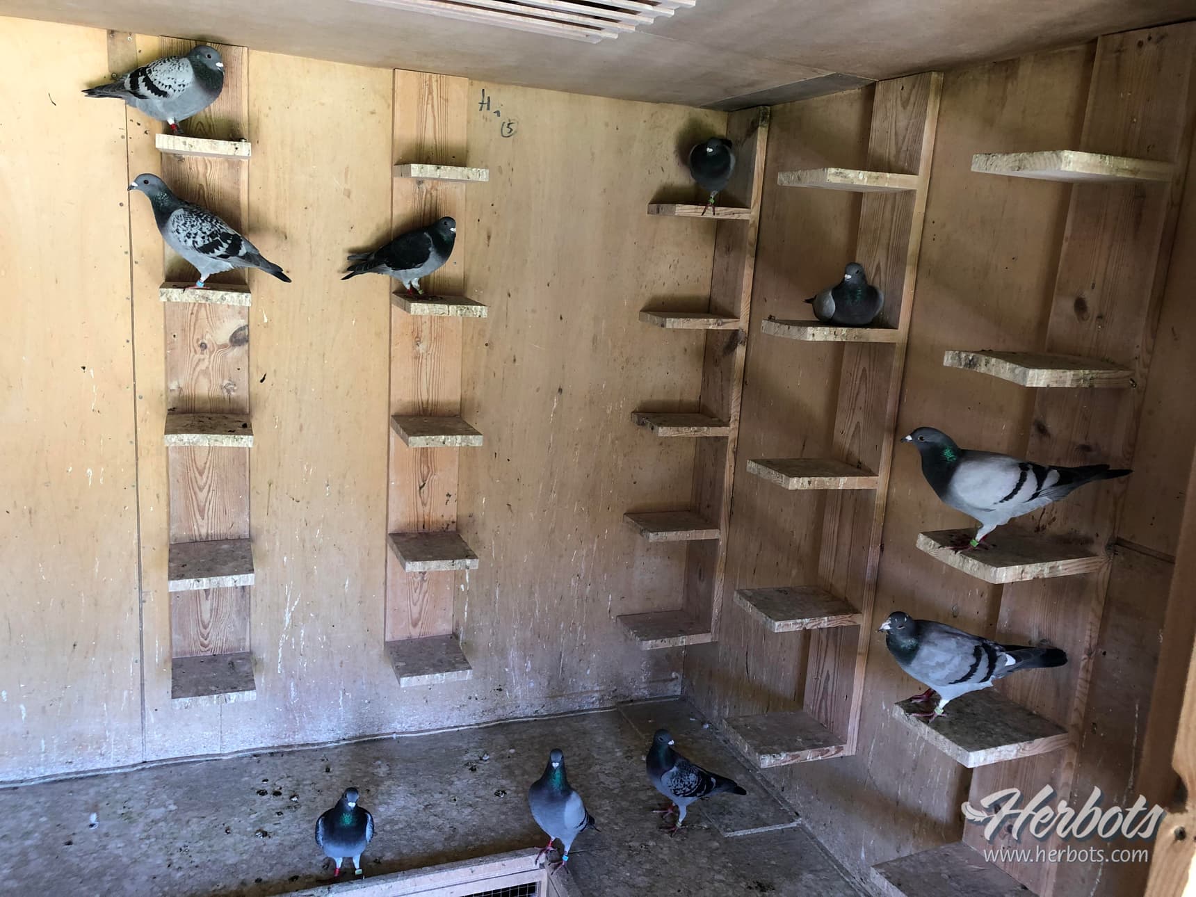 The game with the old and yearlings is played in a separate way here, the cocks do not have a box but a shelf on which they have to get their place on which a saucer fits and on which the old cocks are therefore coupled in the winter and allowed to rest for a few days. brood. Beech blocks are provided on the floor on a normal wooden floor. The yearlings only enter the loft after brooding and then go out every day from mid-February. They now train once a day for 45 to 60 minutes.