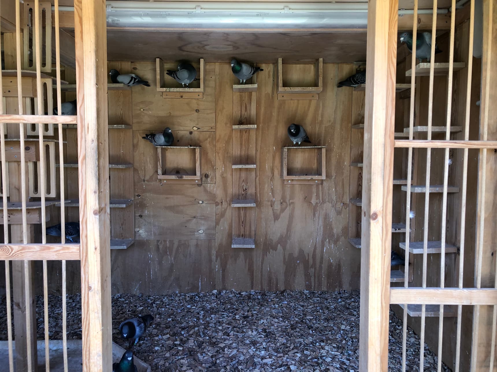 The 1st and 2nd group are in separate lofts until they start flying well, then the rounds come together and the sexes are separated because we don't really play on the “sliding door” system. There are no boxes in the racing lofts, only planks, there is no room for pairs other than the U-plank on the floor. This U-shaped shelf has 40-50 cm of space underneath where the dust can fly away through grilles. Each loft had a corridor and in front of it a large aviary.