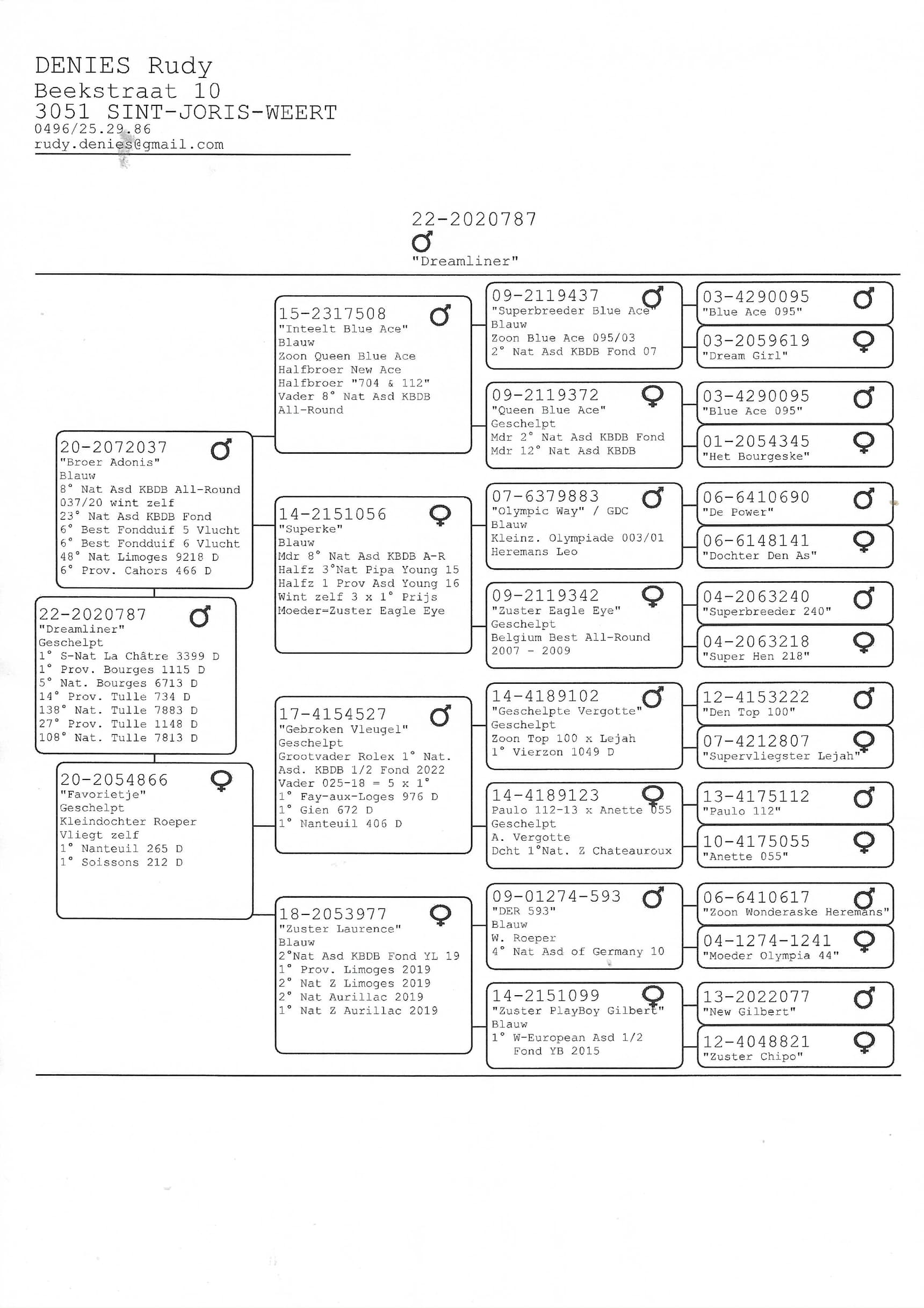 ½ brother “Super Creone” 1 Nat Ace Long Distance Yls KBDB 2020 + 11 Nat Ace M.D. young KBDB 2019.