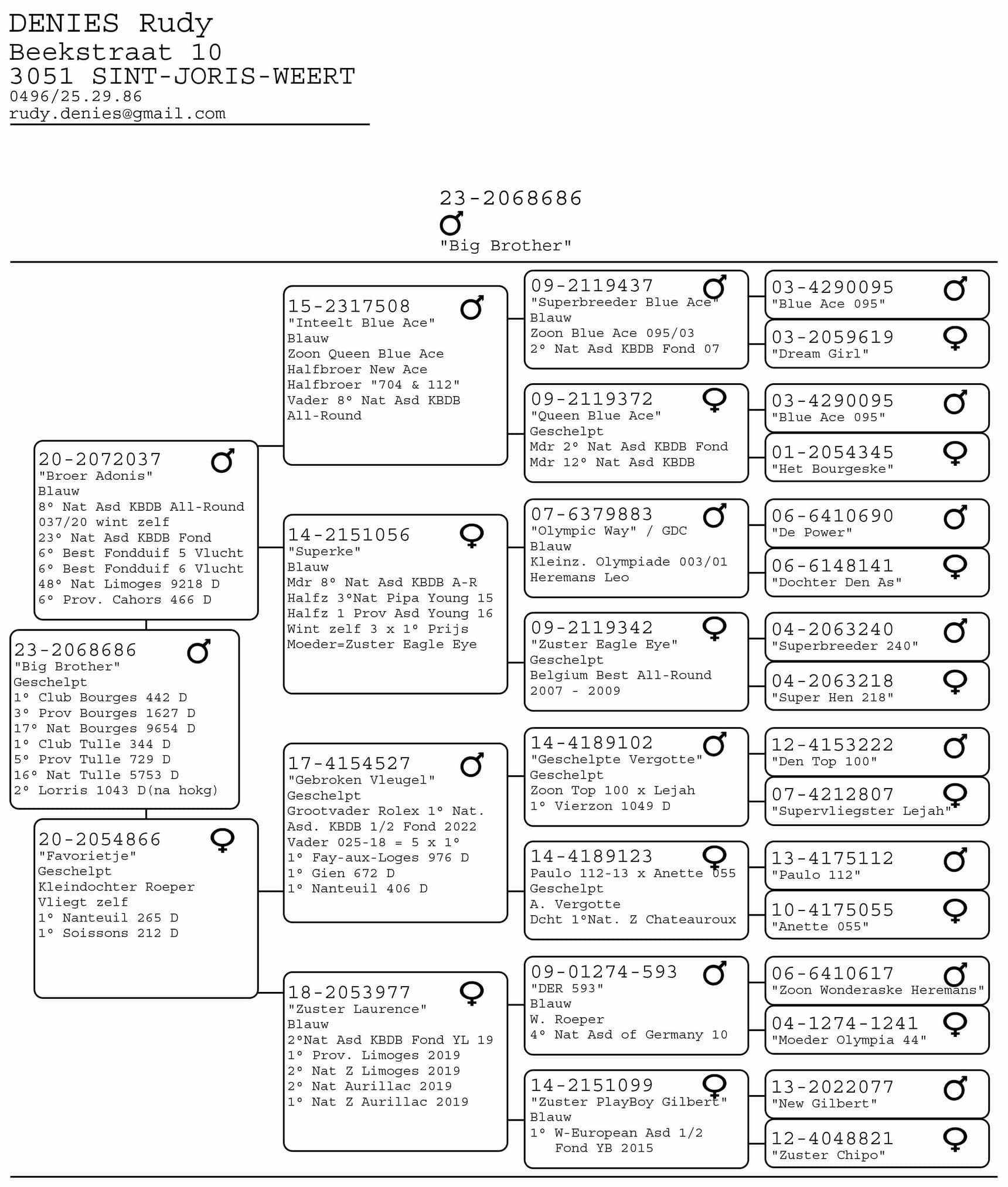 ½ brother “Super Creone” 1 Nat Ace Long Distance Yls KBDB 2020 + 11 Nat Ace M.D. young KBDB 2019.
