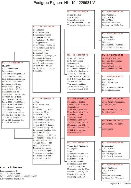 Her mother is “Jewel” a full sister to ao “Miss Possible” 1st Nat. and 1st Intern. Agen ’13 and a daughter out of his base breeding couple “De Heijde Doffer” x “Vicky” a hen from Jan Polder via Mijnis Gijse, Echteld. See pedigree