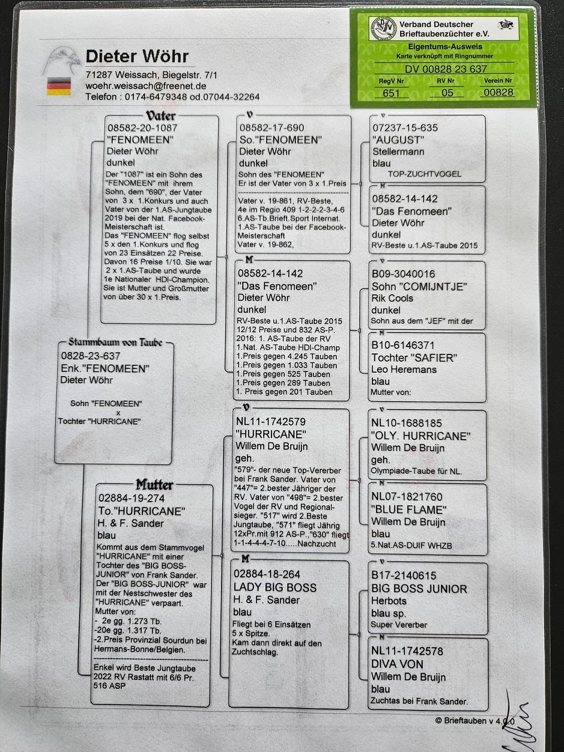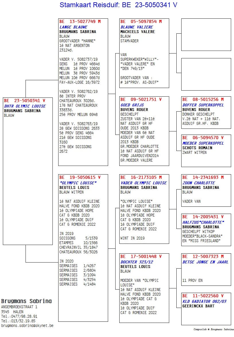 Daughter of “NL 259/11” Son Olympic Hurricane Willem De Bruijn x “DV 264-18” Daughter Big Boss Junior Herbots