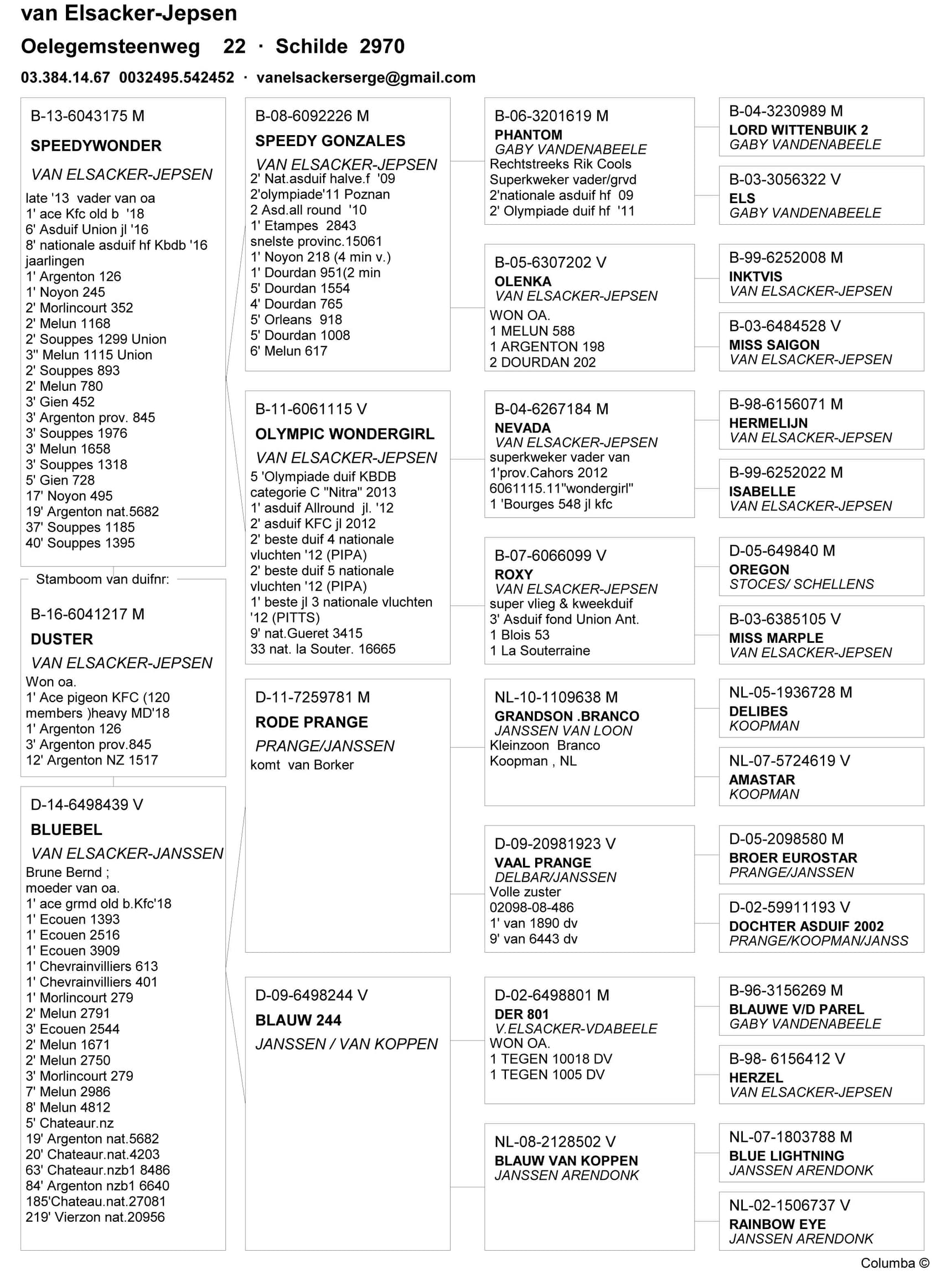 If you belong to the top of the Belgian pigeon sport for more than 30 years, then you have a broad base of information and knowledge... there is no discussion about that. But what we find most impressive is that Serge and Kirsten have managed to stay at the top of the Belgian pigeon sport for so many years. An assignment that is anything but simple and which requires a tight management of the pigeon colony. And... let's be clear... we're not talking about achievements of decades ago, let's take a look at the highlights of the last decades: 2nd National Ace pigeon half distance 2009 with "Speedy Gonzales", 2nd Olympiad half distance 2010 also with "Speedy Gonzales". "Tinkerbell" hit her battle in 2011 resulting in the 4th Olympiad pigeon half distance. During the 2013 Olympiad in Nitra "Vanity" (9th Olympiad pigeon cat. H) and "Wondergirl" (5th Olympiad pigeon cat. C) were at the party and then you have to have a look at the list of the national ace pigeons KBDB since 2015... classifying yourself between the national KBDB ace pigeons is anything but an "easy job" and our Antwerp sport friends can put the next unique list on the table:
