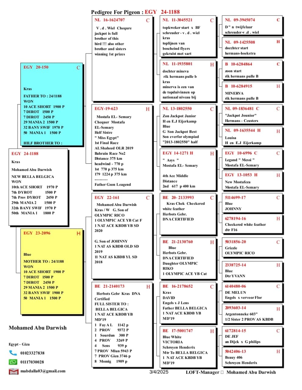 We received another reference from Egypt from our super breeder “Olympic Rico”. This time Mr. Mohamed Abu Darwish has a new top pigeon of 2024, EGY 24-1188 who shone on several flights against an average of 1500 to 2000 pigeons. The father of this pigeon is a 100% Herbots pigeon.