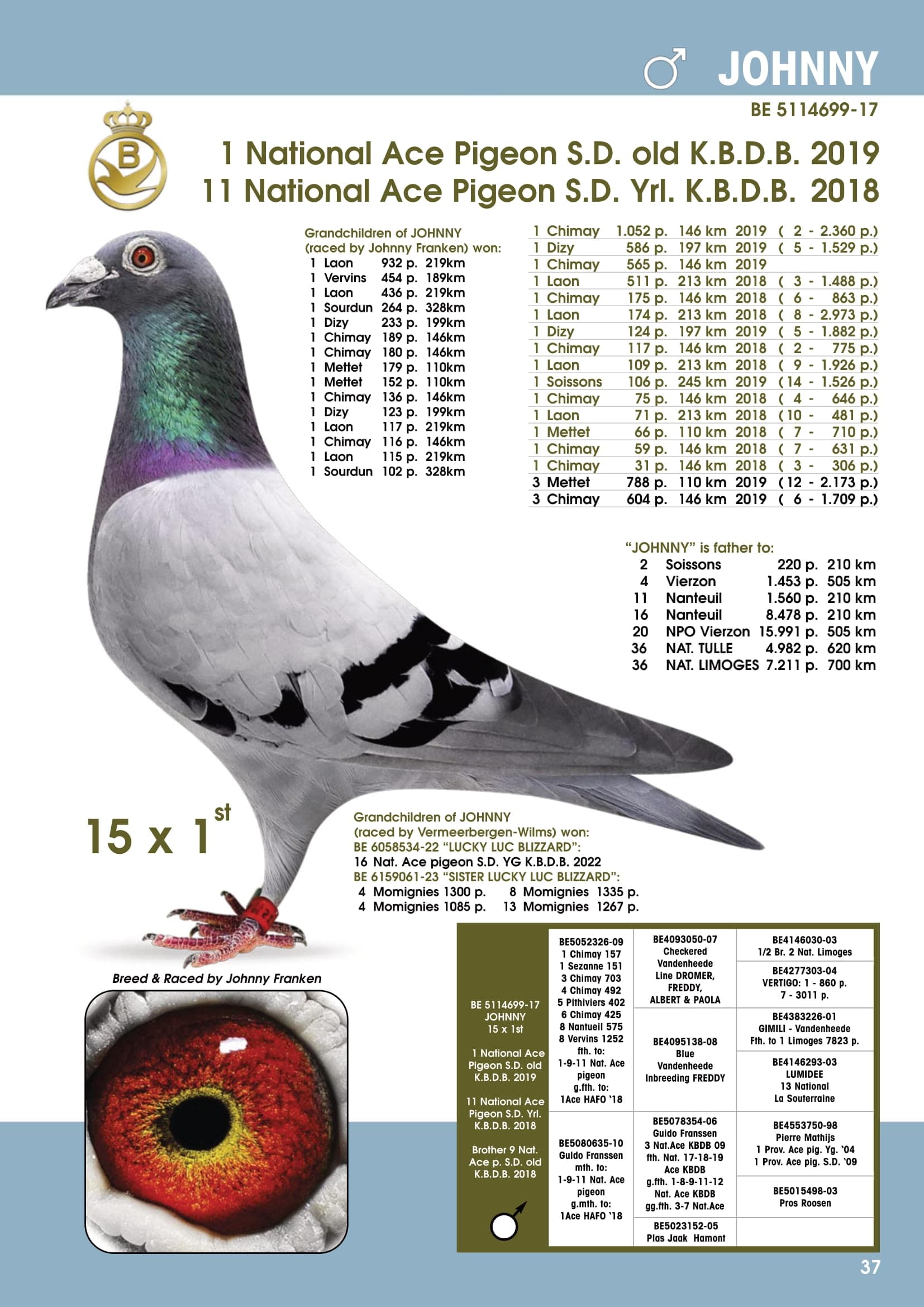 The grandfather is “EGY 22-161” who was bred from 2 original Herbots pigeons. He is a child of “Son Johny” coupled with a daughter of “Olympic Rico”. These were both 2 super racers on the speed.