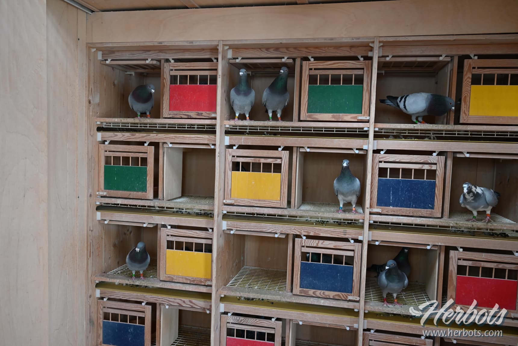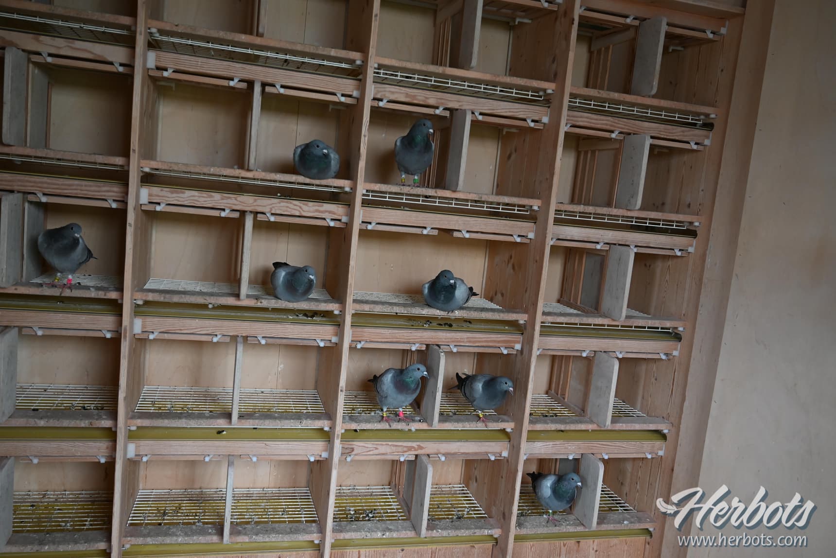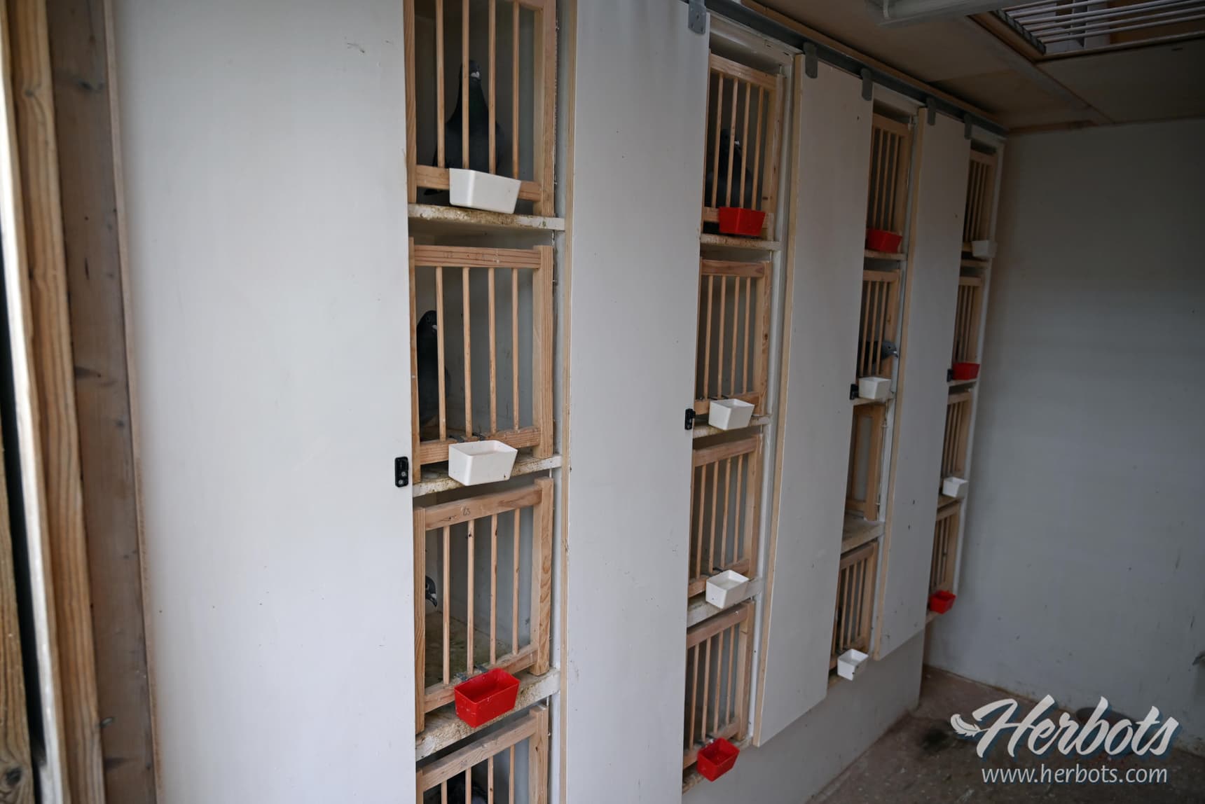 Unlike the cocks, the hens are darkened and this during the first 2 weeks of April. Two weeks of darkening, whether this really makes such a difference? Well yes... you should know that we play our hens on widowhood until mid-August and then those 2 weeks of darkening really prove their worth. The hens fly the heavy middle-distance and long-distance flights. Like the widowers, the ladies train twice a day and are fed twice a day. During the day, they live in special small living boxes (see photos). After their training, they are first allowed to eat and pick up some fresh grit and then they are confined to their living boxes where they can drink. The hens are divided over 4 lofts. Those are 2 lofts to the left of the 4 widowers' departments and 2 to the right of them.