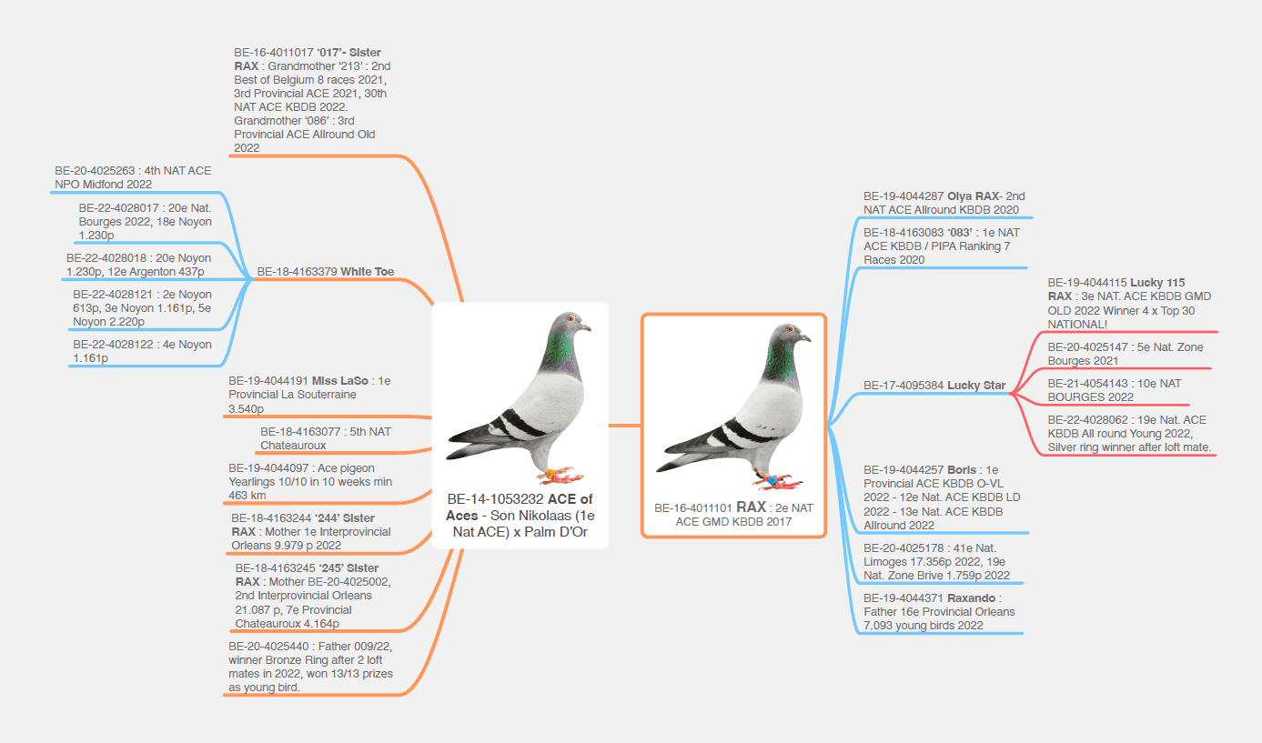 1st base line is a pigeon from Casaert-Sénéchal (son of 1st National ace KBDB "Nicolaas" x his mother "Palme d'Or" - also mother of 1st Nat. ace KBDB "Amalia") coupled with a pigeon from Staf Vermeiren which won 7th National ace KBDB ½ Fond.