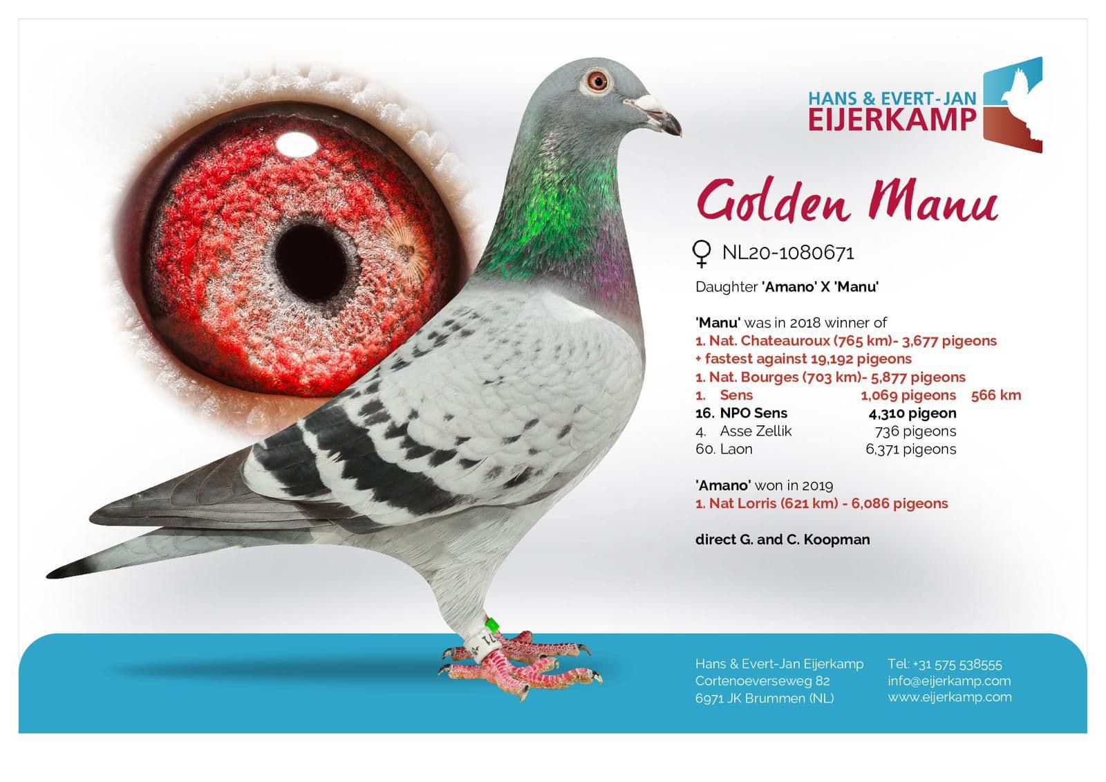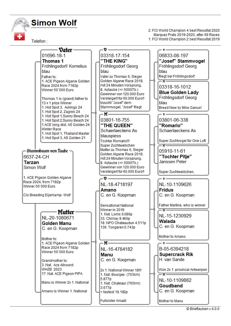 On the maternal side, Golden Manu was purchased by Eijerkamp in Brummen from Gerard Koopman. She is the daughter of the renowned ‘Manu,’ who won two national races in challenging weather conditions on one-day long-distance raced. Golden Manu has proven her worth as a breeder time and again. In addition to 'Tarzan,' she is the mother of multiple successful pigeons, including several Ace Pigeons. In 2023, Team van der Pasch bred the 3. National Ace Pigeon Allround WHZB from one of her daughters.