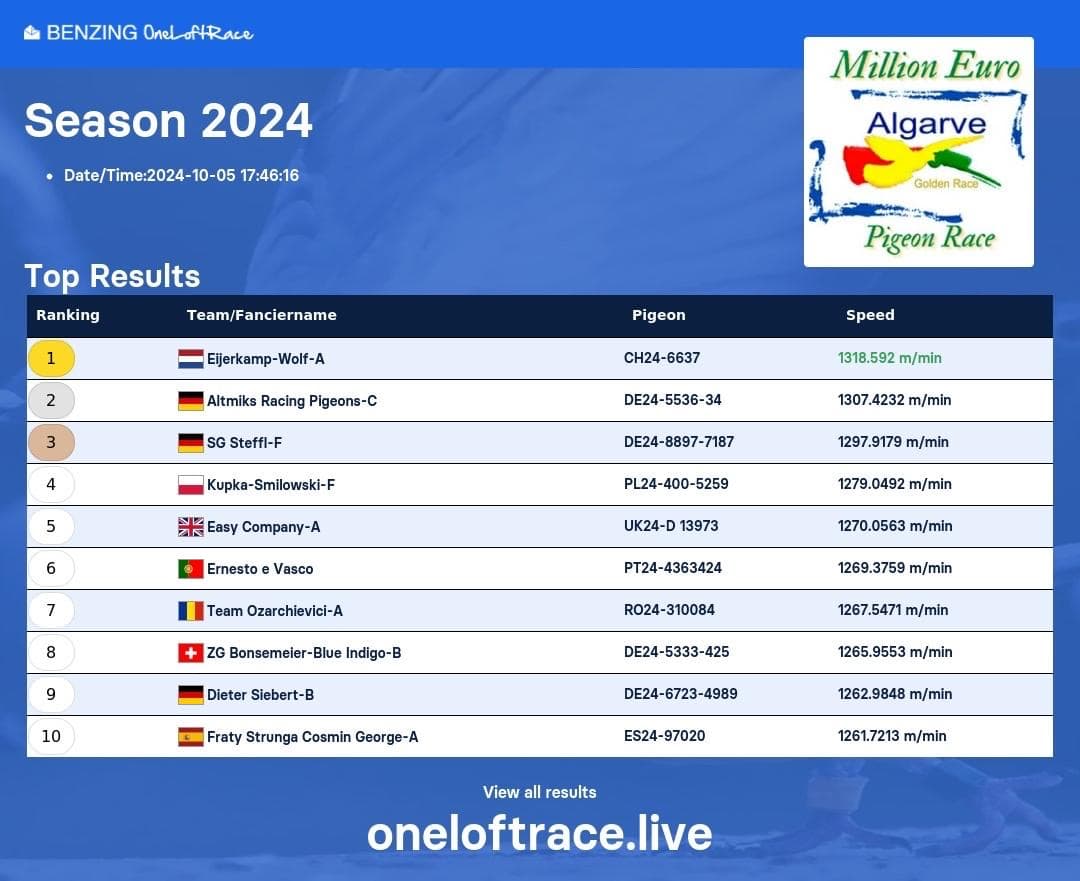 team eijerkamp-wolf 1st ace pigeon golden algarve race 2024