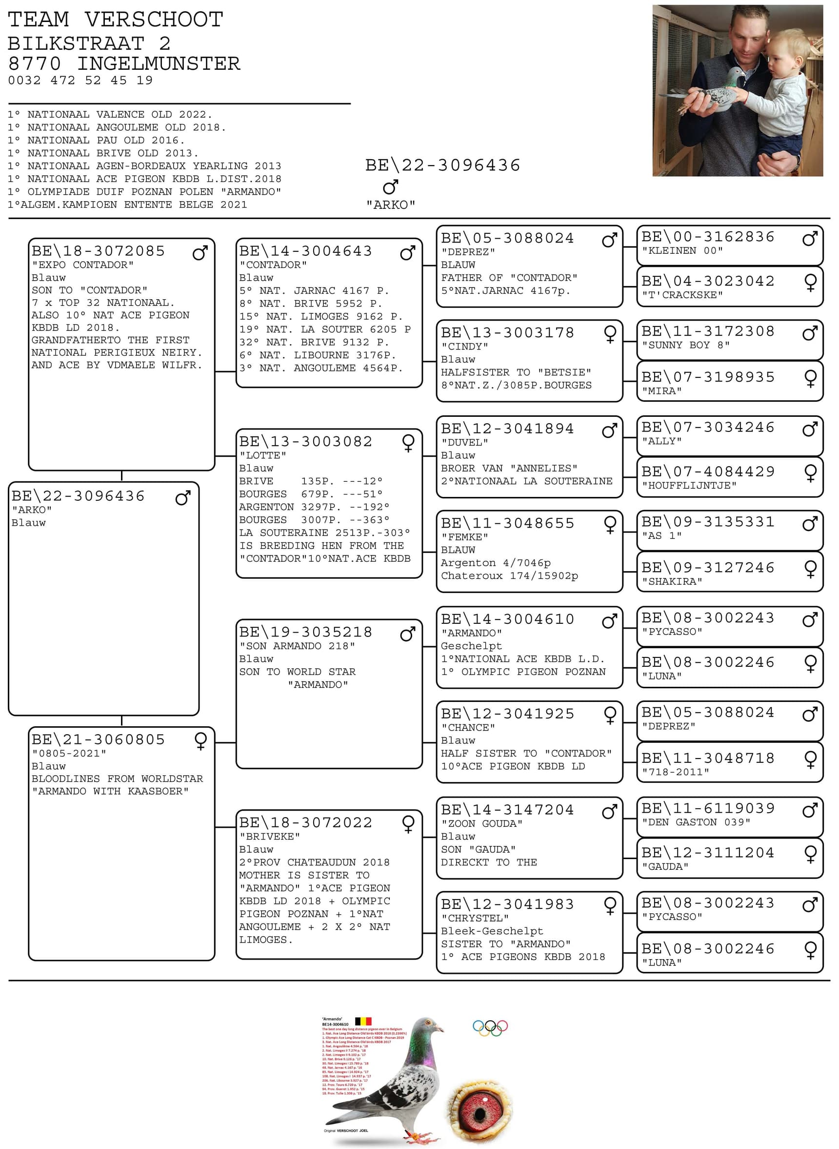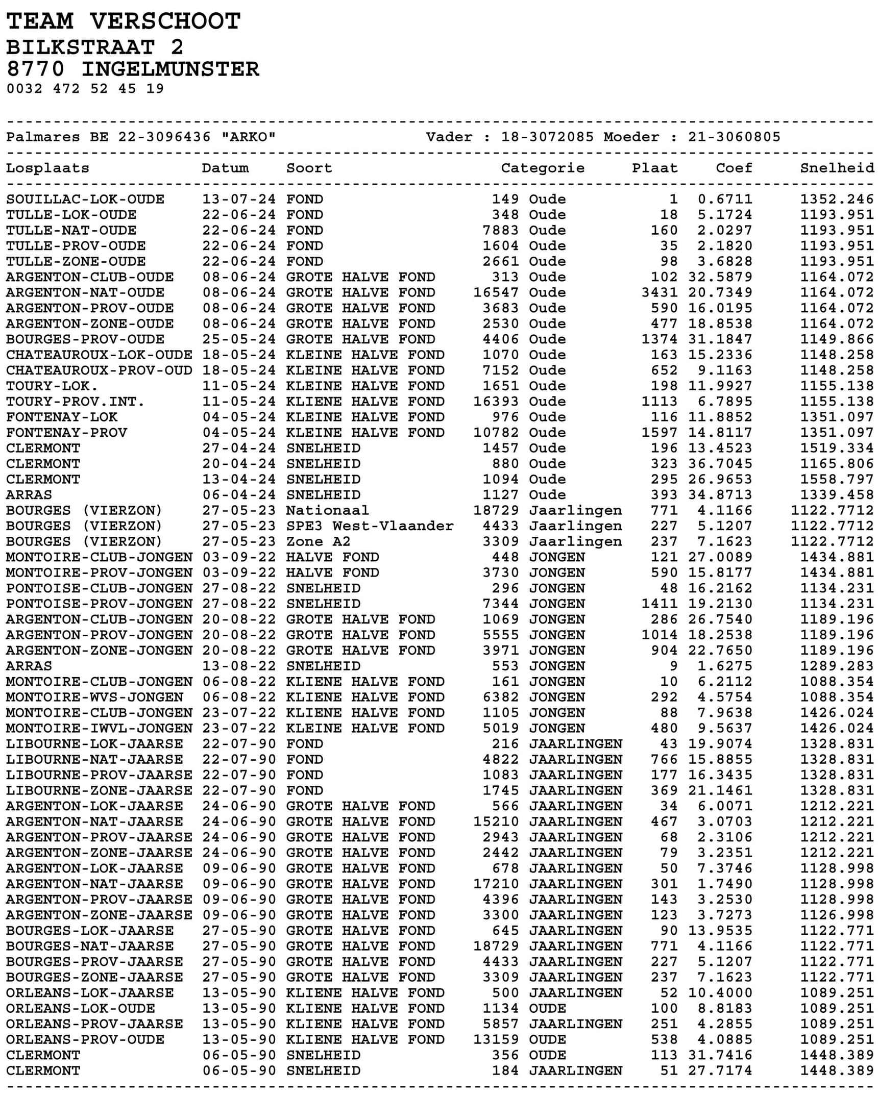 Team Verschoot...no...it is not a new name in Belgian pigeon racing. Team Verschoot stands for Dieter Verschoot who continues the life's work of father Joël Verschoot. Not that daddy Joël said farewell to pigeon racing completely, no...only a step aside was taken. Joël moved and son Dieter took over the house, garden and pigeon lofts. Now it is Dieter who limns the lines in which football is played. Dieter has known the ins and outs of pigeon racing for years. Thanks to the support of daddy Joël, he can reach into a "pocket full of experience". Partly thanks to the necessary enthusiasm and motivation, he is finding his way to the top and with the necessary successes because look last weekend they won provincial Souillac