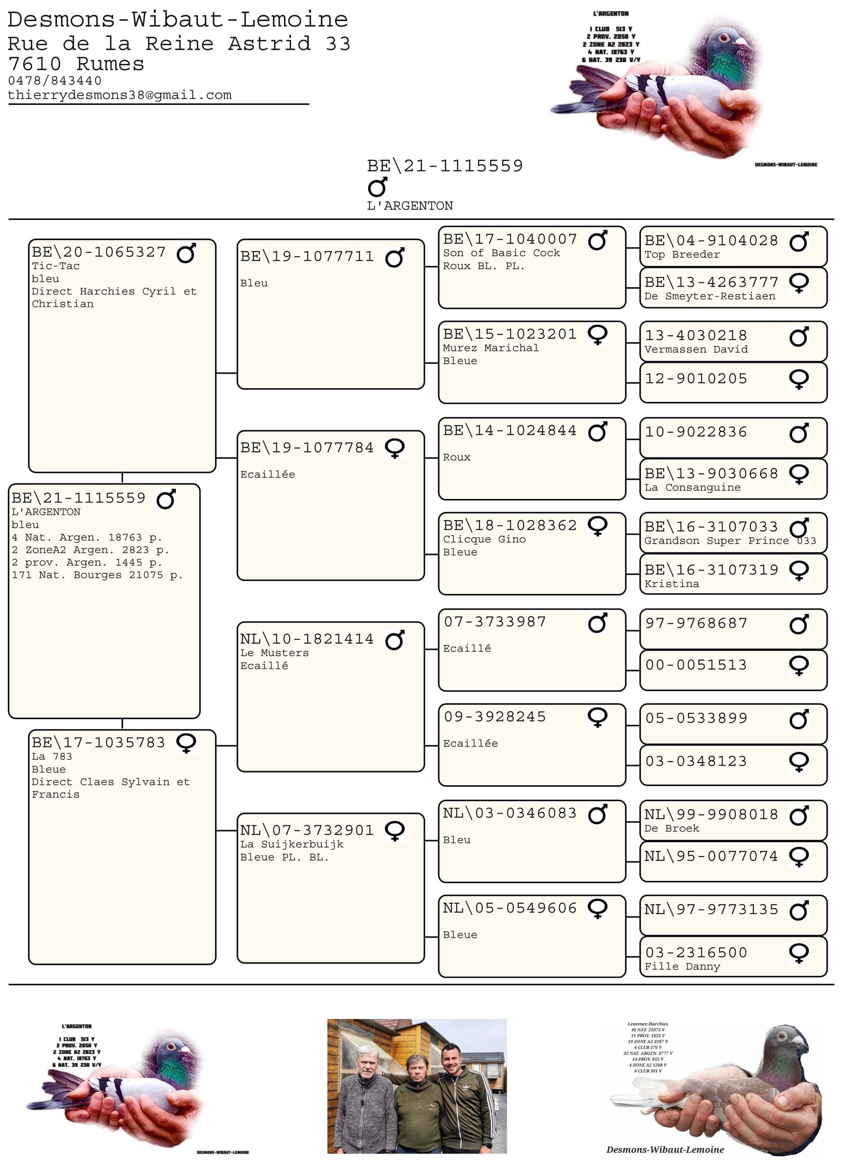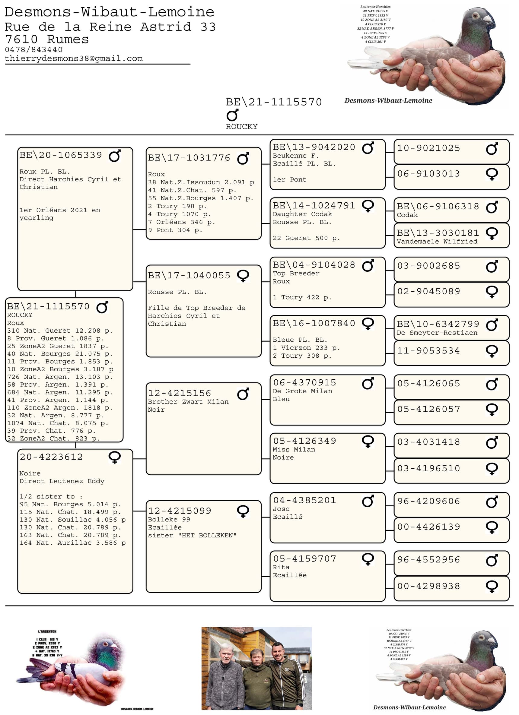 Most of the pigeons come from Christian & Cyril Harchies (Warchin), enriched with birds from Leutenez Eddy & Maarten (Kruishoutem), Joël Verschoot (Ingelmunster), Claes Francis & Sylvain (Taintignies), and Despierre Maxence (Rongy).