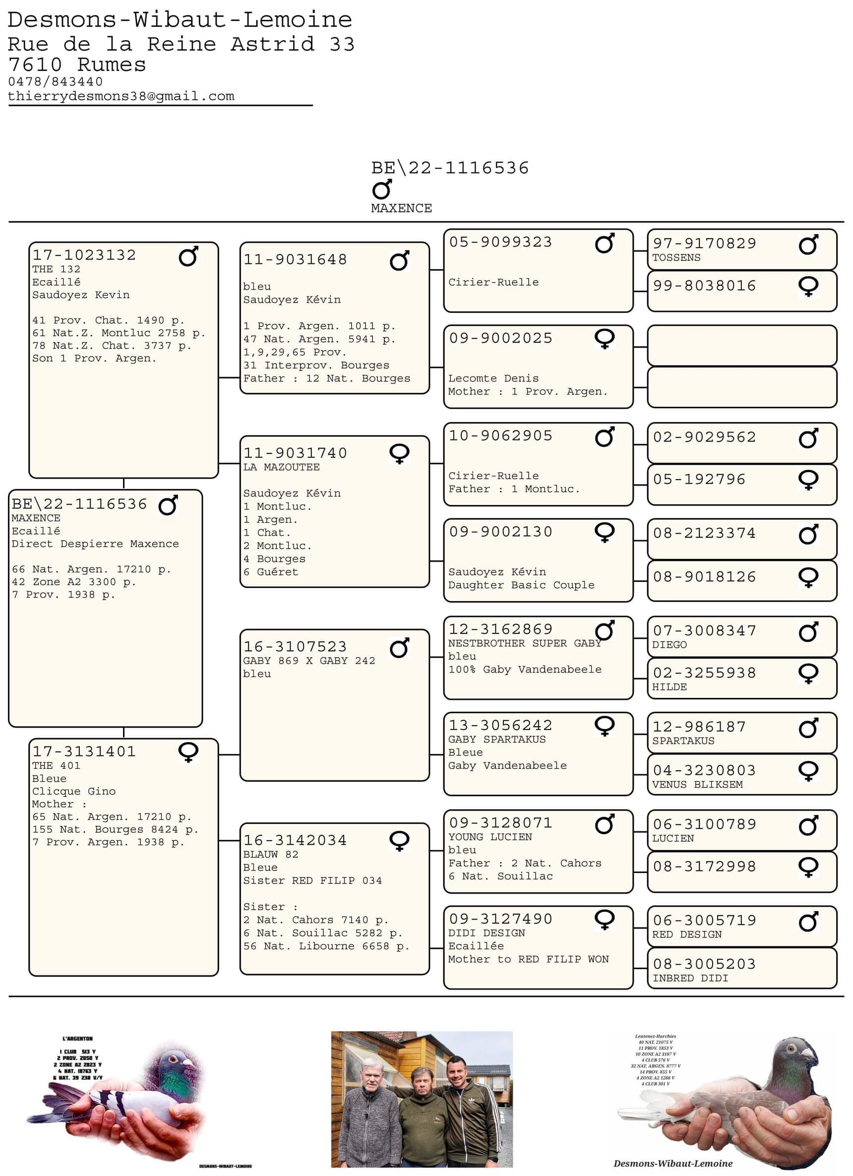 direct from Despierre Maxence, out of a cross (Saudoyez Kévin x Clicque Gino) won the 66th Nat. Argenton 2023 (17,210 yearbirds)