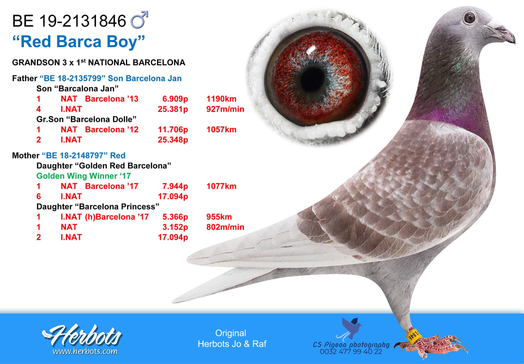In that same year of the 'Golden Red Barcelona', the Herbots family was able to buy an iron strong hen. This hen won the 1st National in France against 3,152 pigeons and was the fastest hen International against 5,336 hens and from all the pigeons that were released in Barcelona she won the silver medal. She raced over a distance of 955km against an average speed of 802 m/m.
