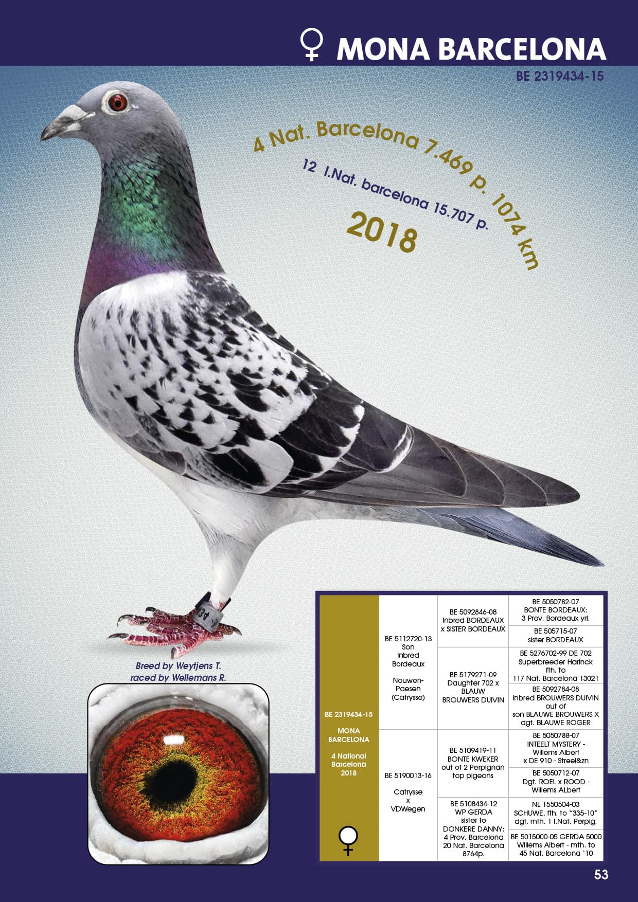 This top hen won on her 1st Barcelona race the 4th National against 7,469 old pigeons in 2018 over a distance of 1074km. Also a very hard edition and came home with an average speed of 861 m/m. On the international level she became the 6th fastest hen against the entire pack.
