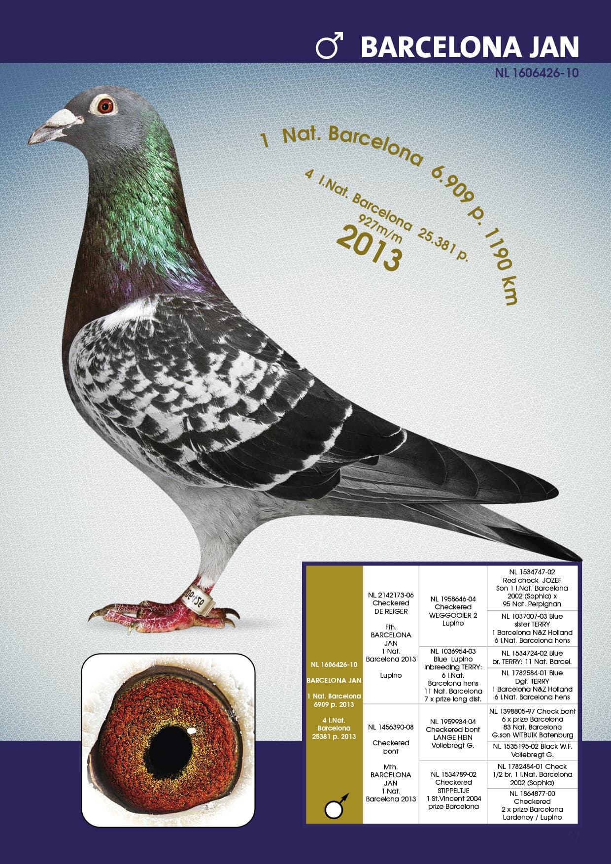 This one won in 2013 1st National Barcelona in Holland against 6,909b over a distance of 1190km. This was a very hard edition where he got home with an average speed of 927 m/m where he also won the 4th spot on the international level against 25,294 pigeons in total.