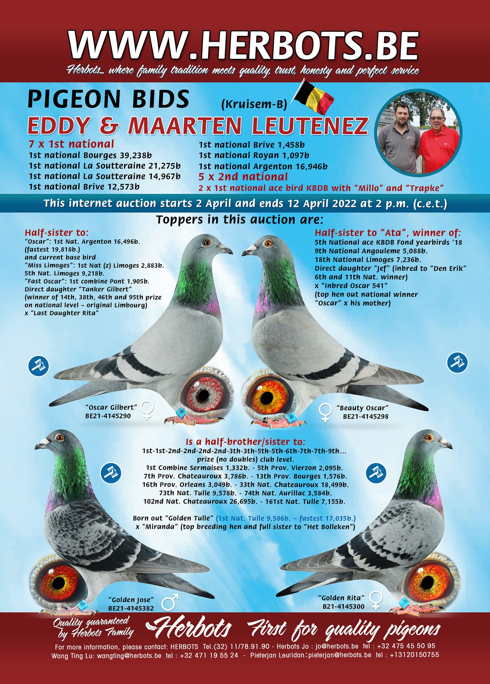 At this moment Eddy and Maarten offers a well selected group of 8 birds on internet auction Pigeon Bids.