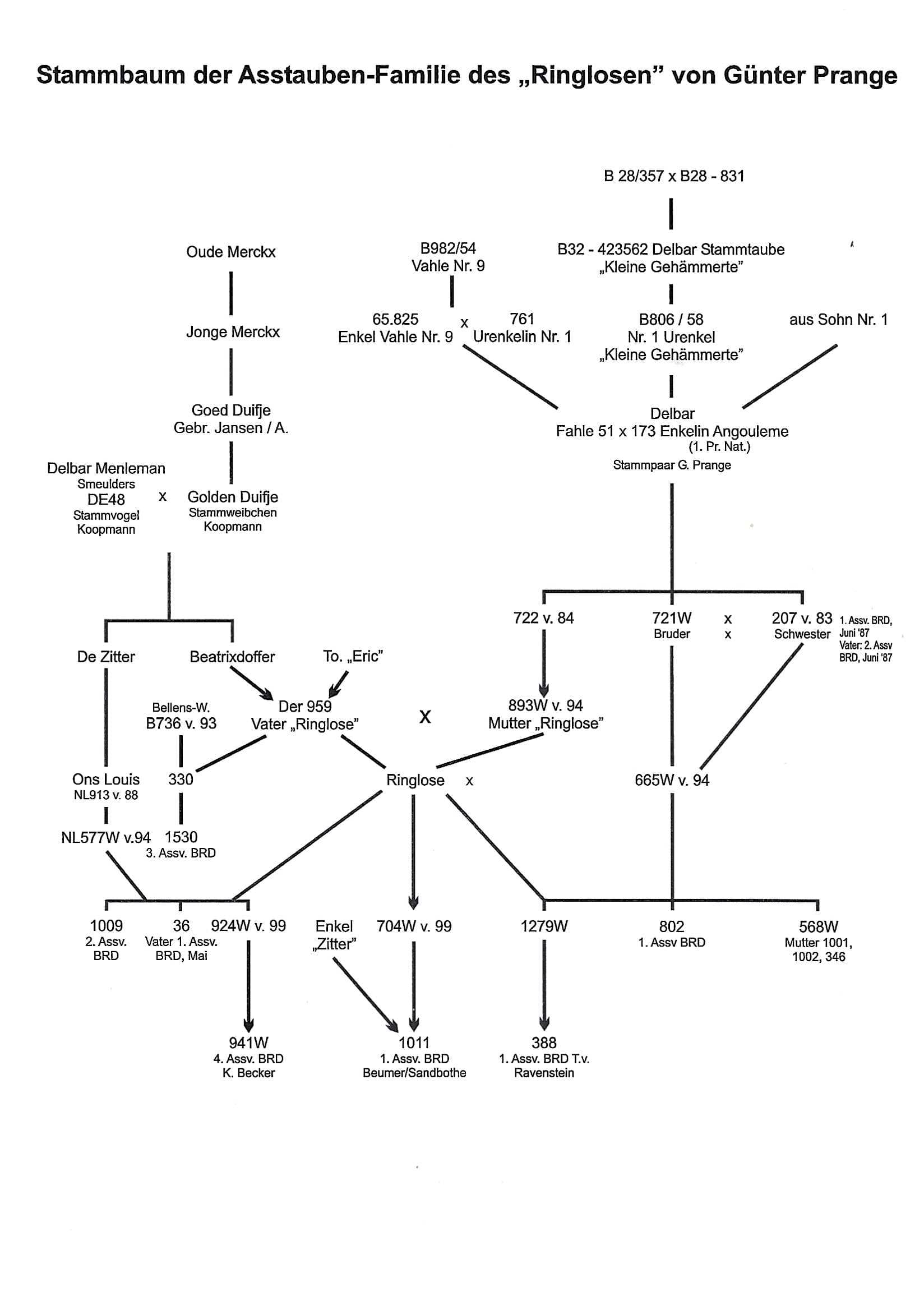 Another son of the "959", the so-called "Ringlose" became father of outstanding breeding and racing pigeons. His mother is still from the old Delbar strain. A son of the Ringless, the 02098-99-802, became Germany's first ace pigeon in 2001. From a daughter of the Ringlose, the 02098-99-704, the well-known fanciers Bernard Beumer and Theo Sandbothe bred the 05991-01-1011, which also became 1st acebird of Germany in 2002.