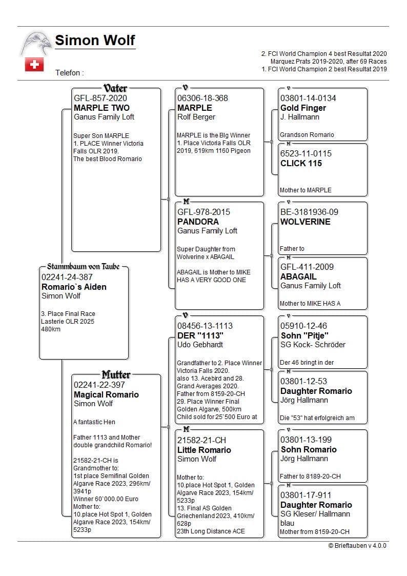 Alp Race Team/Simon Wolf (Switzerland) is international known for his high quality OLR birds.