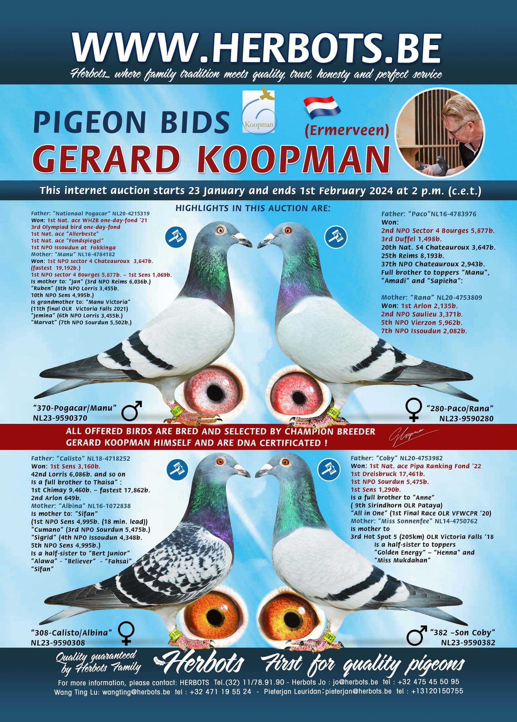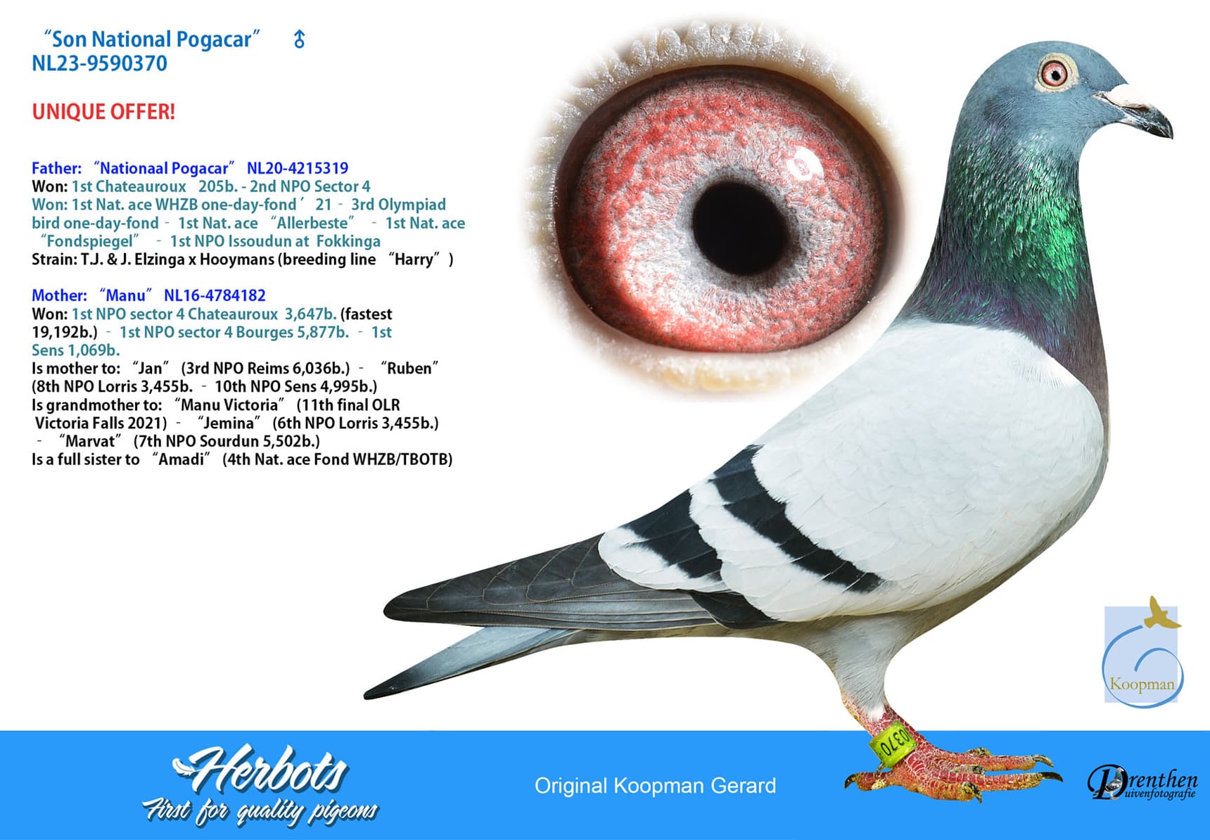 In the current internet auction Pigeon Bids Gerard Koopman is offering a son of "National Pogacar" (coupled against “Manu”) .