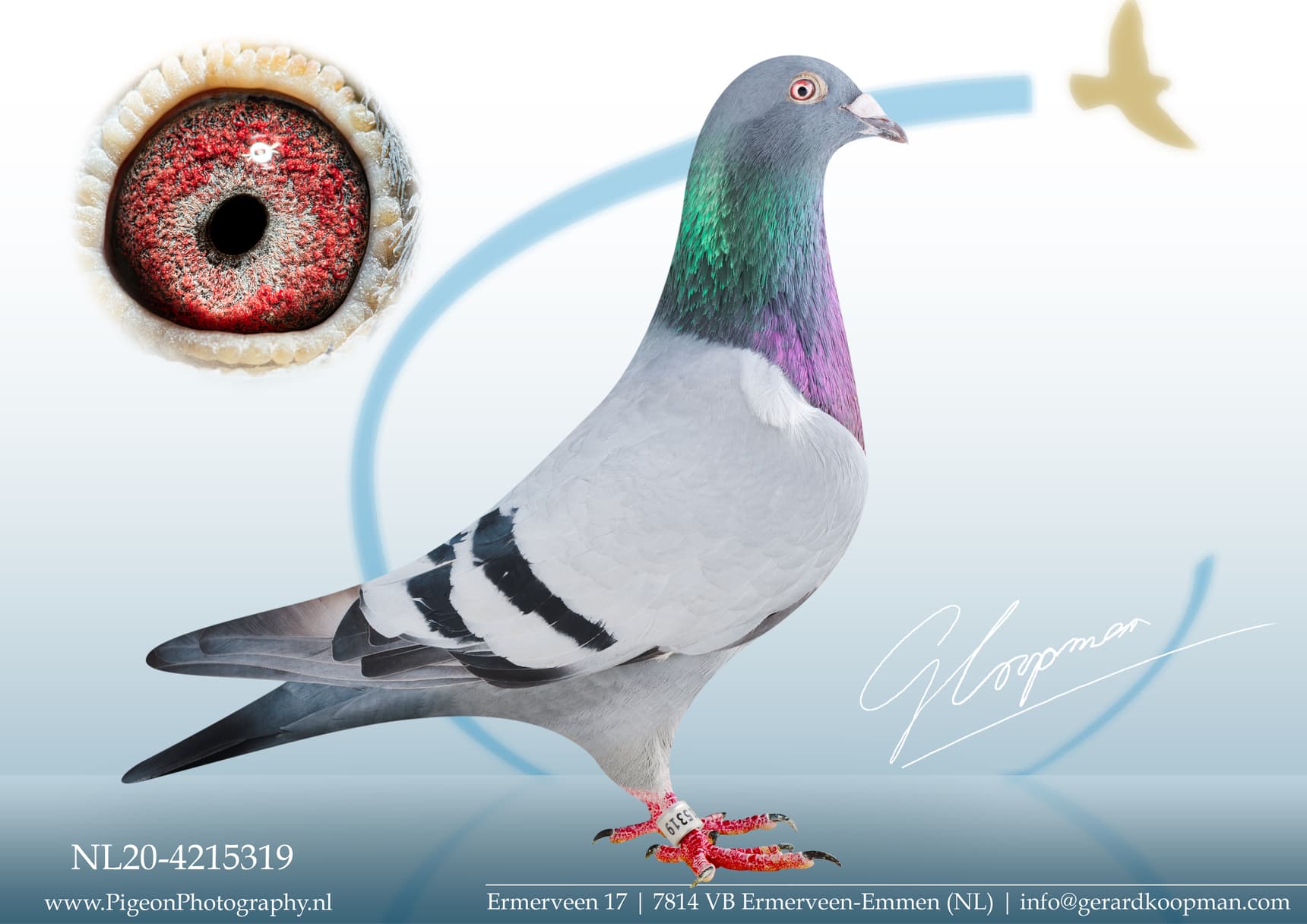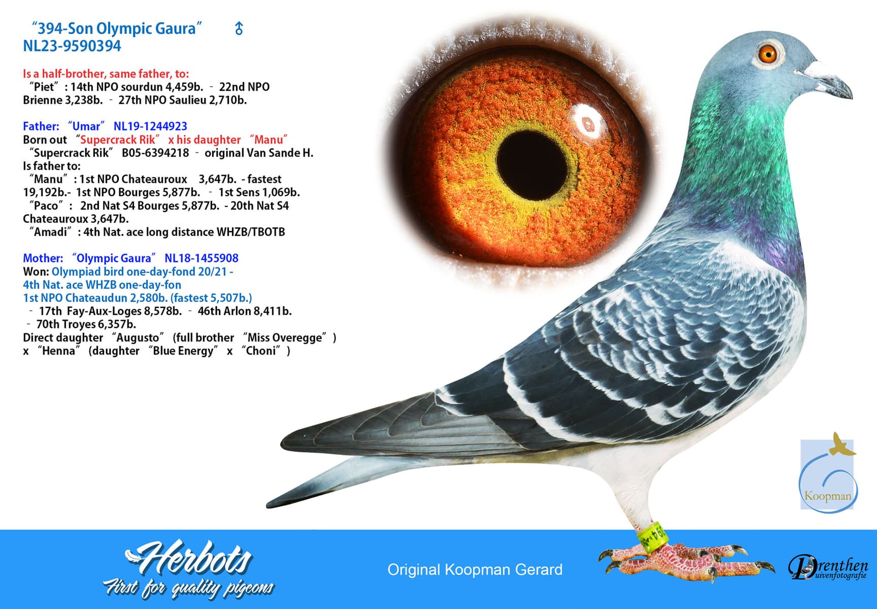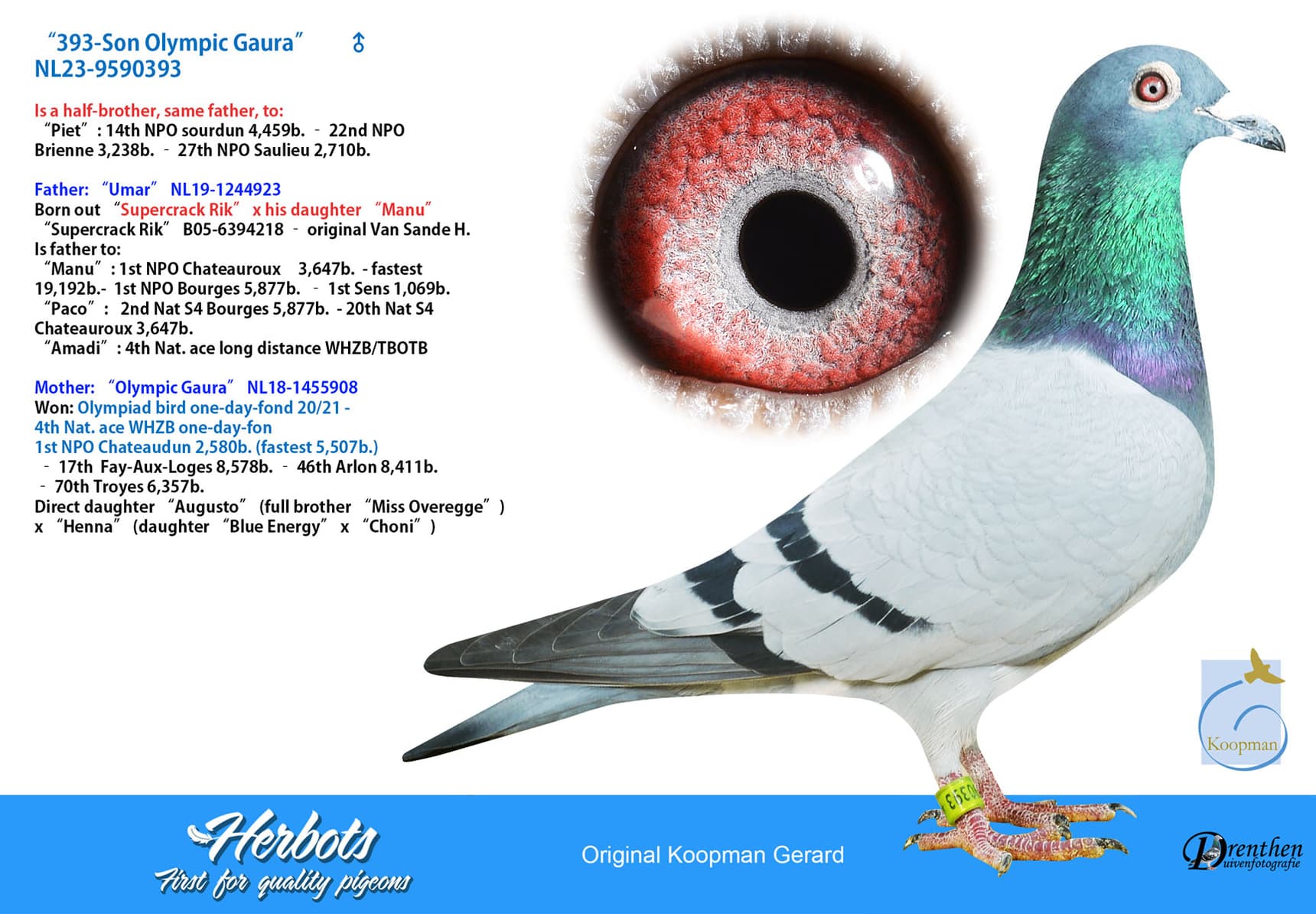 "A true topper who represented the Netherlands at the Olympiad. Bred from a "brother Miss Overwege" and then I come back to the fact that breeding pigeons from a family of exceptional toppers is so important after all. "Miss Overwege" won so easily against thousands of pigeons after all. With "Olympic Gaura" the proof is given that the line of "Miss Overwegge" continues nicely.