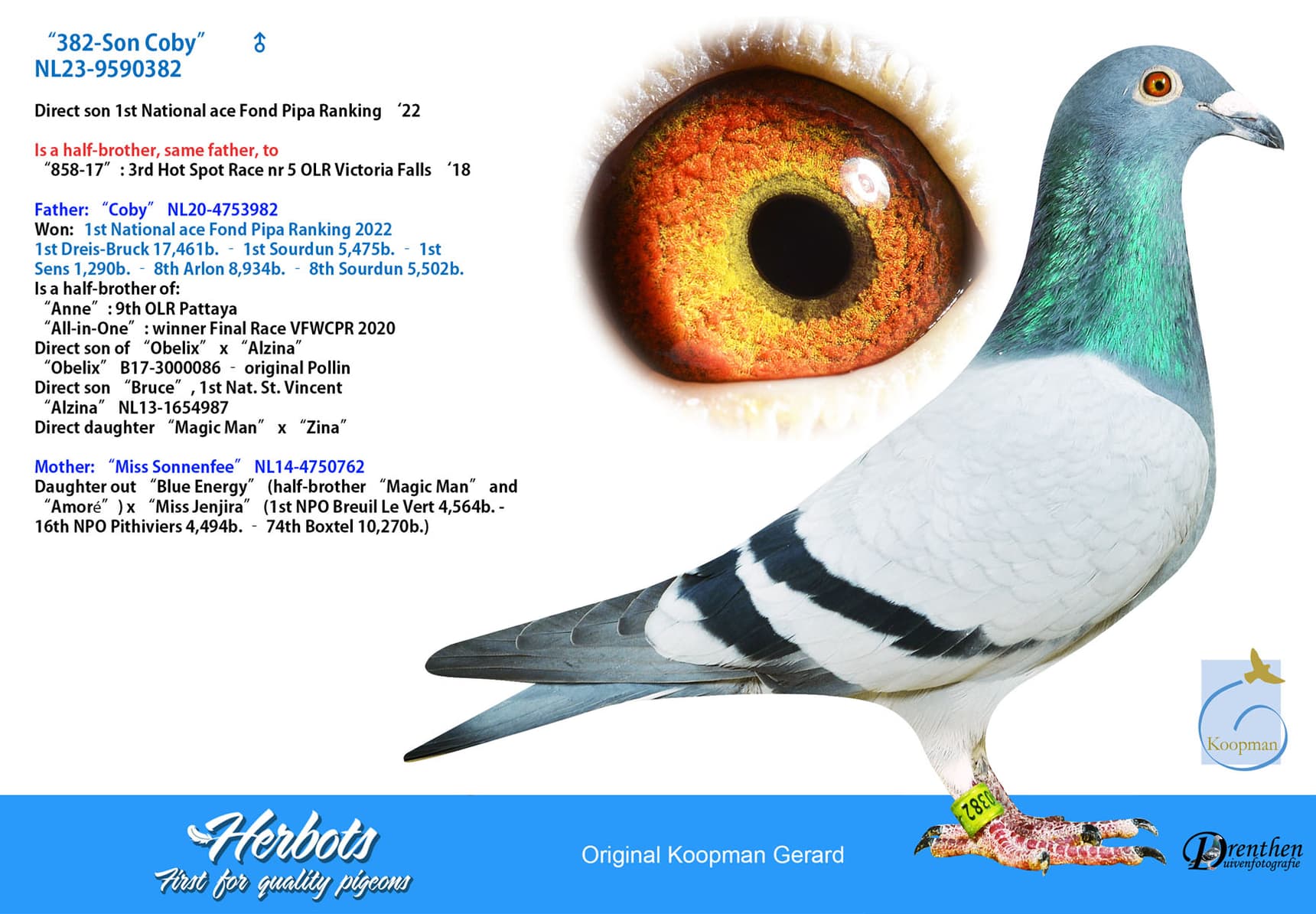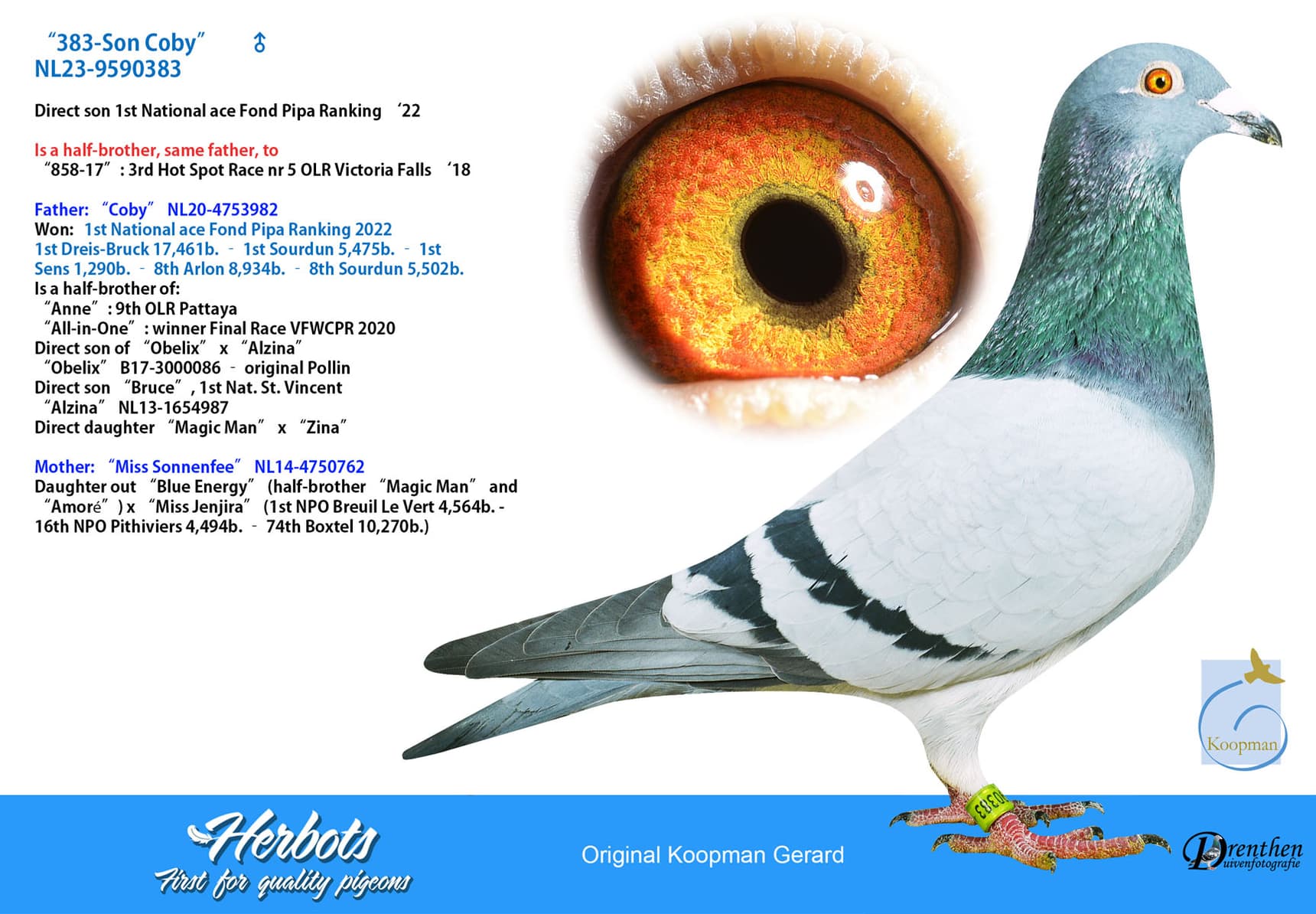 Won: Olympiad pigeon long distance 20/21 - 4th Nat. ace pigeon WHZB one-day long distance - 1st NPO Chateaudun 2580d. (fastest of 5,507d.) - 17th Fay-Aux-Loges 8,578d. - 46th Arlon 8,411d. - 70th Troyes 6,357d.
