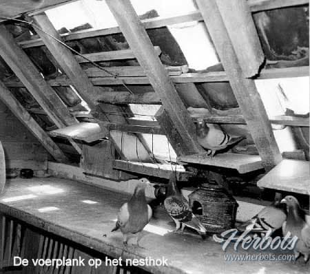 Fancier who had the opportunity to visit the brother Janssen and were expecting a huge villa with a big entrance and huge lofts behind the villa, were in for a surprise when they turned in the Schoolstraat in Arendonk and found a very simple house at n°6 which was built before the first world war. The famous white gate aside the house gave access to the garden behind the house. At the courtyard you could find a small loft which they called the ‘aviary’. There were some breeding couples and some older pigeons. Left of it was a garden loft where the young birds resided. In front of the loft there was an open aviary. This is where the widow hens resided. What stroke immediately when you entered the small court yard was a water well under the pear tree. Out of this well they took the drinking water for their pigeons. The nest pigeons and widow cocks resided at the attic of the house. In the roof there were some shelves.