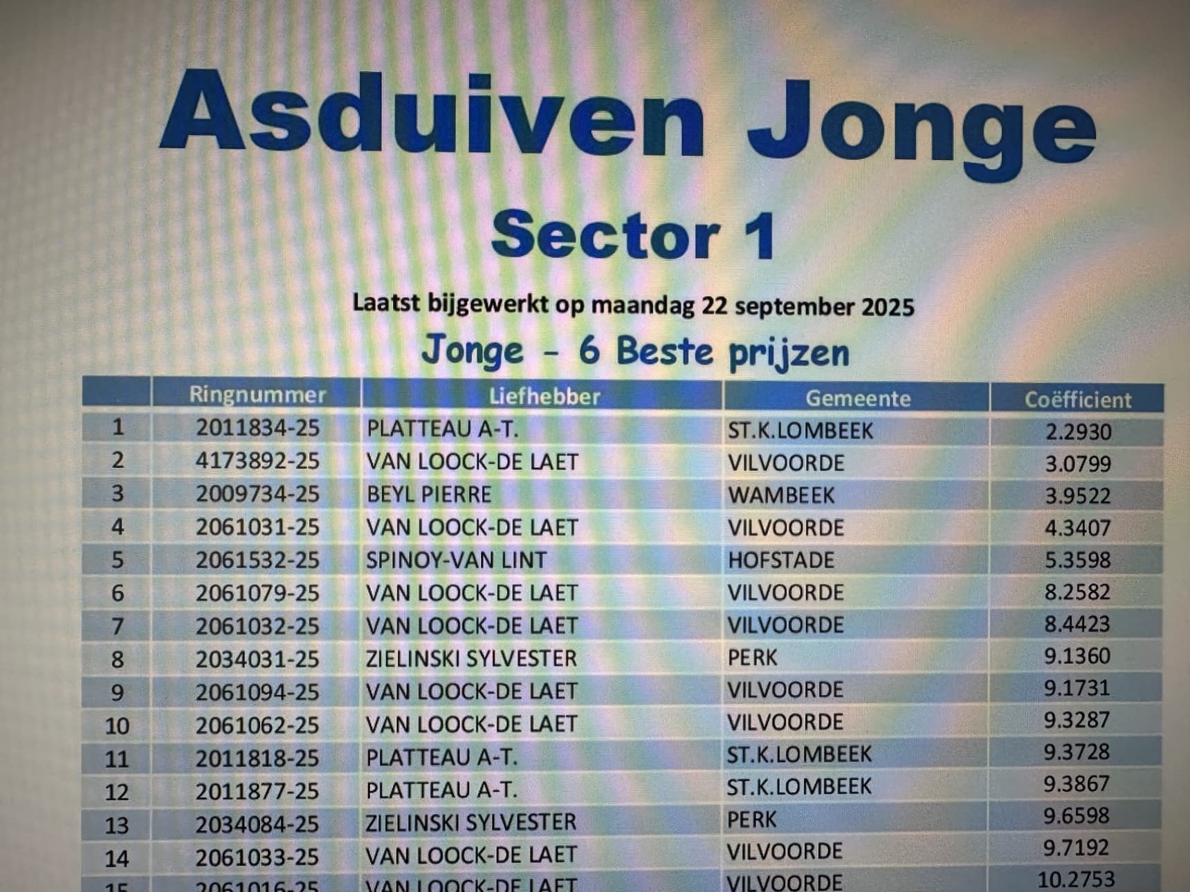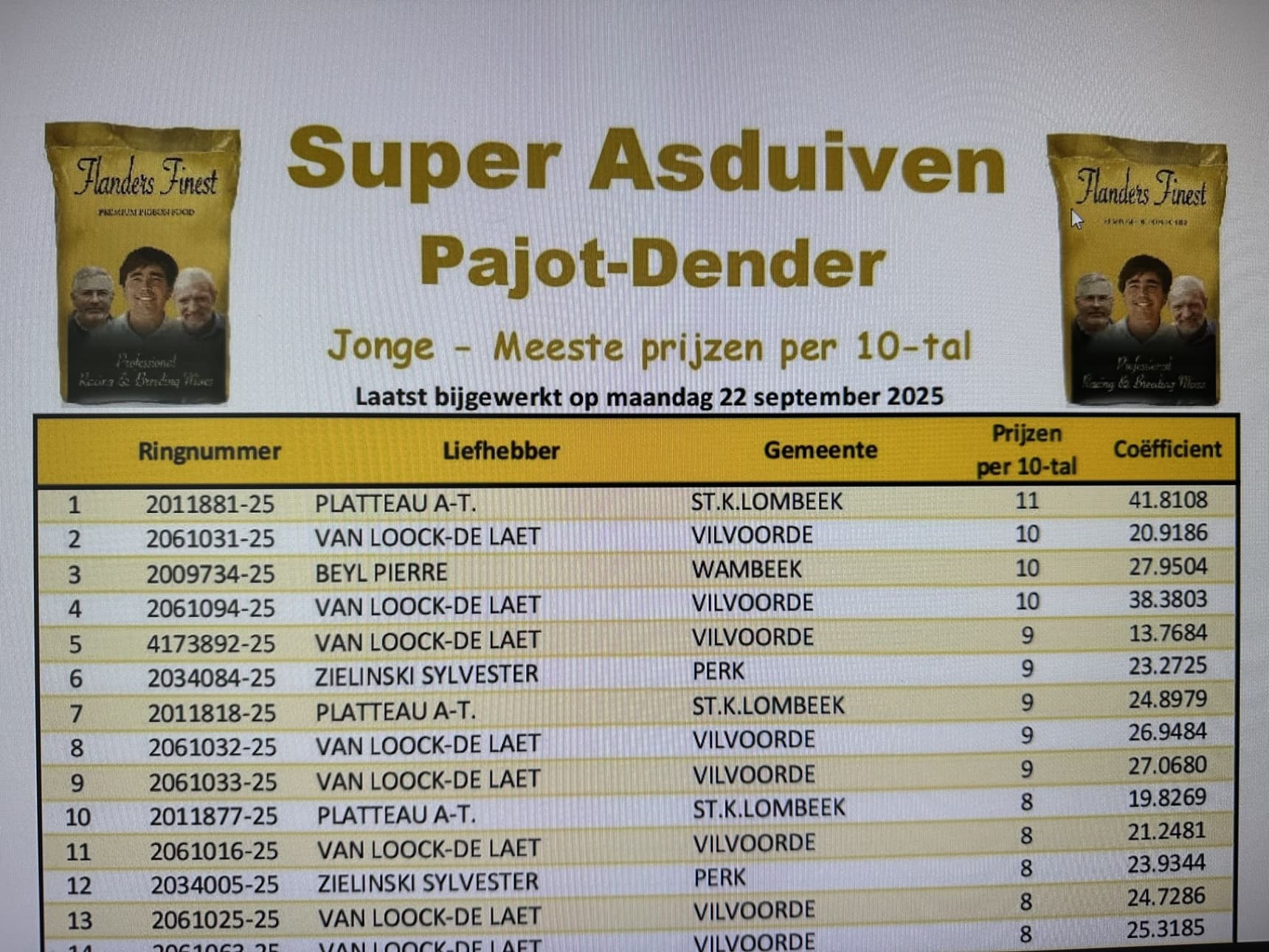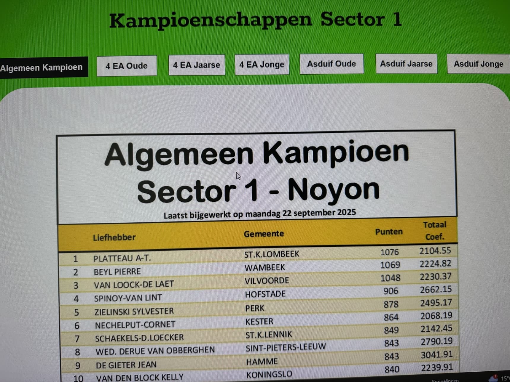 For the second year in a row, 1st General Champion Noyon Sector 1… easier said than done, as the competition in this competition is at an unprecedented level. Sector 1 is a speed league where Pierre Beyl (winner of 1st National Ace Pigeon KBDB Sprint Young Birds 2025) and Yannick De Ridder-Bruno Vandenbrande (winner of 1st National Ace Pigeon KBDB Sprint Old Birds 2025 – 1st National Champion KBDB Sprint 2025) have made their mark. But these aren't the only champions who cross swords there every week. Fanciers like Claeskens Jo, Van Loock-De Laet, Nechelput-Cornet, Peetroons Hans, Van Roy Geert, Schaekels-De Loecker, etc. shouldn't be underestimated.