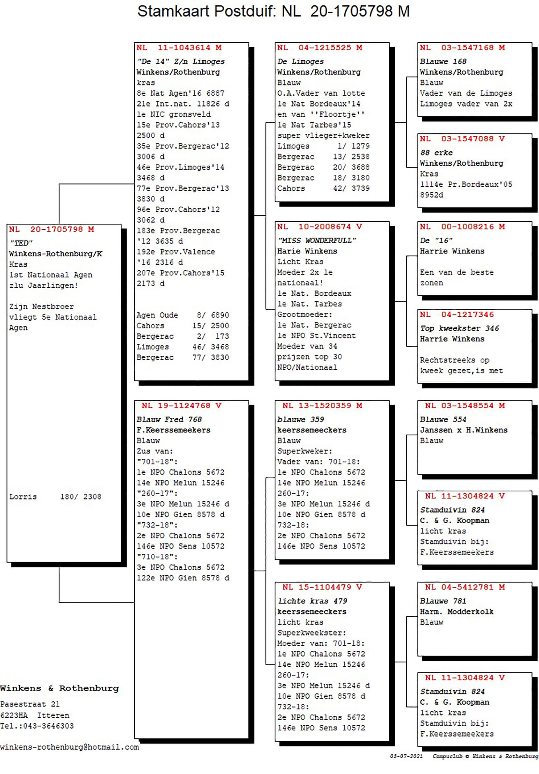 * He obtained eggs from the best yearlings in 1999 and 2000 from father Harry and son Roger Wijnands at the Ringenhoeve in Maastricht. Later it turned out that his base cocks were "Vale 208" and "Blauwe 203" (grandsons of Blauwe Vanoppen). Many top level pigeons have emerged from it, such as the famous "De Limoges 525" (1st Prov. Limoges) etc.