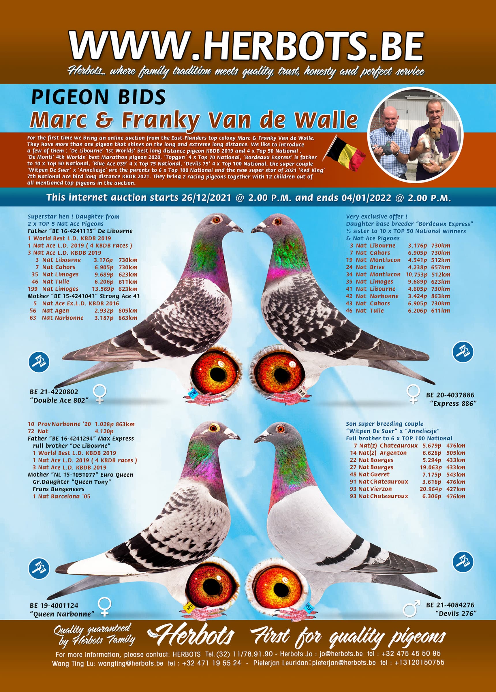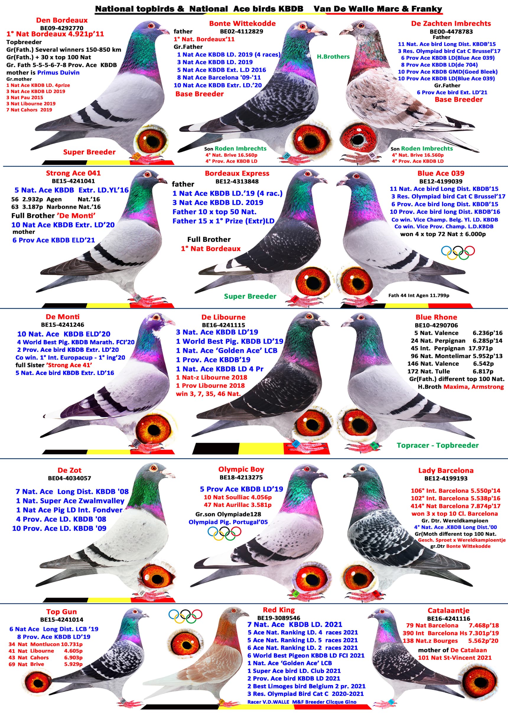 For the first time there is an internet sale of this top colony Marc & Franky Van de Walle from the East Flemish Zwalm. Pure class what these 2 brothers conjure up and how they have been performing super for several years from middle distance to extreme long distance. Long distance pigeons that are not present at 200 or 300km, they do not like that. Prefer pigeons that do it everywhere and preferably fly TOP NATIONAL. They have the pigeons for it and the quality simply drips from it when you take the best pigeons through your hands here. They again performed very well in 2021 with several top finishes in the championships.