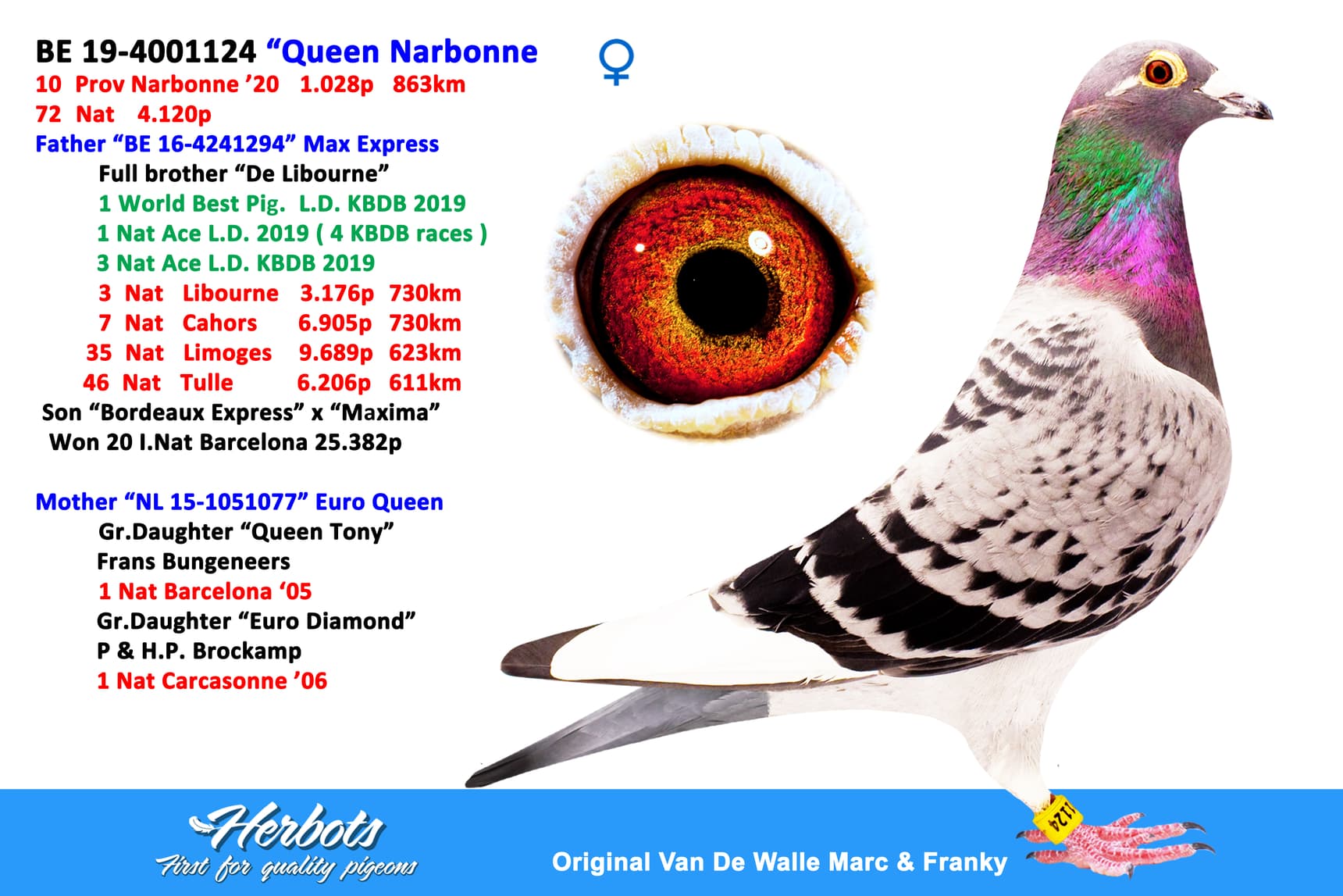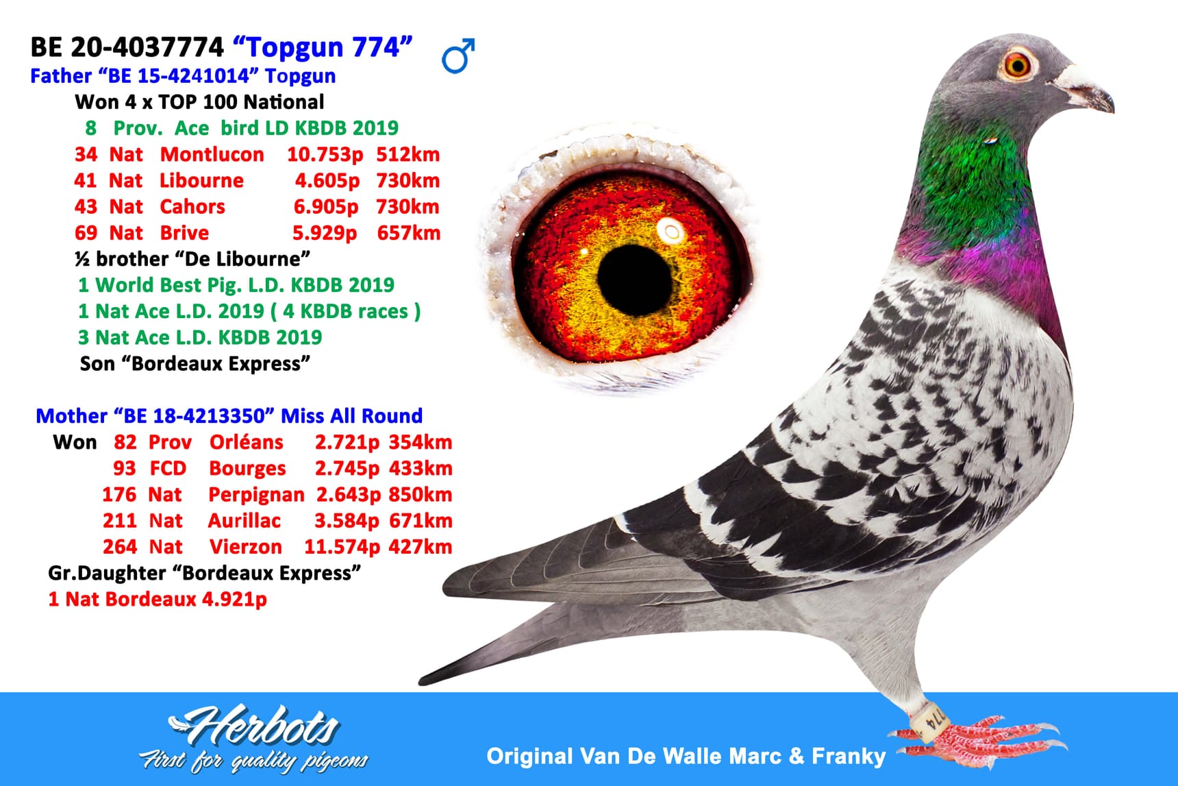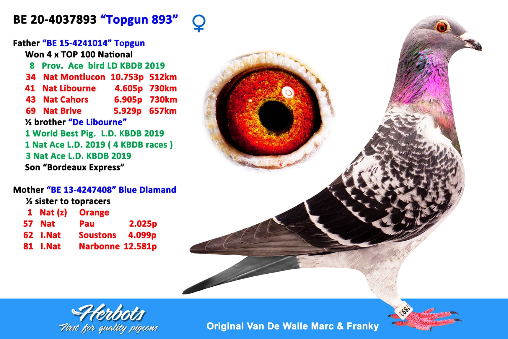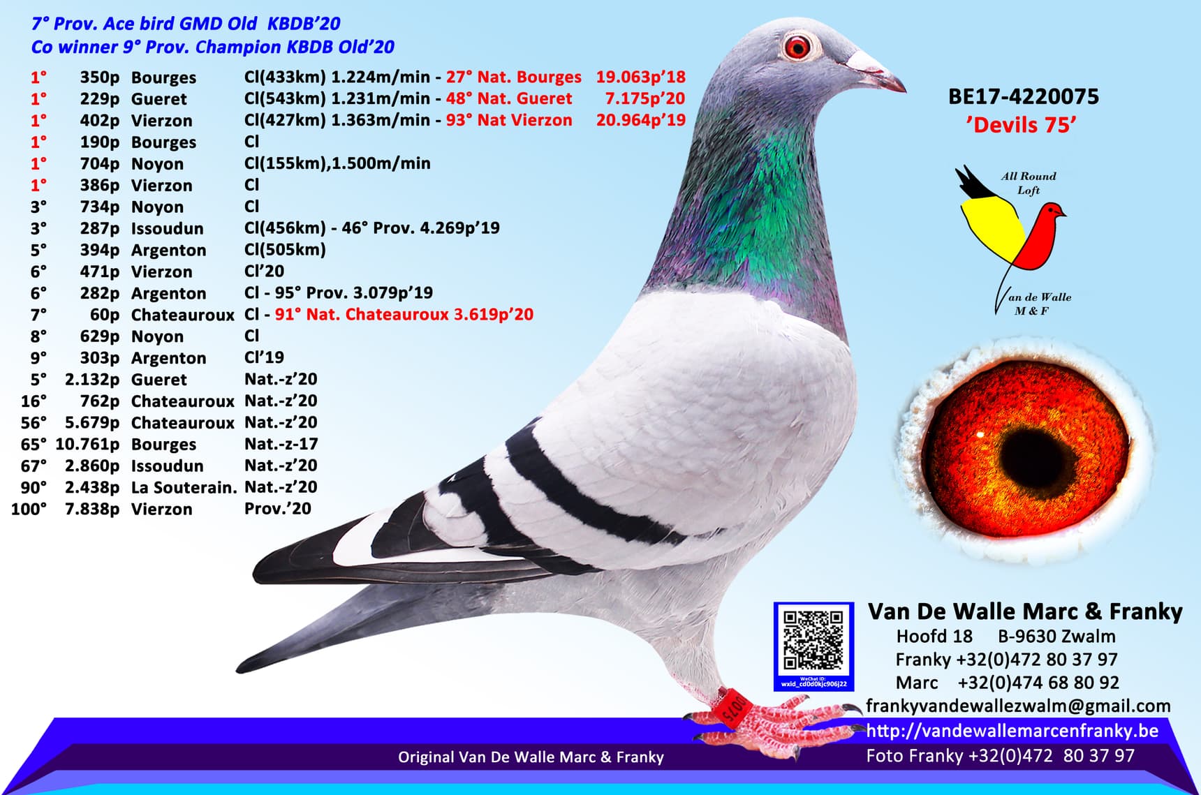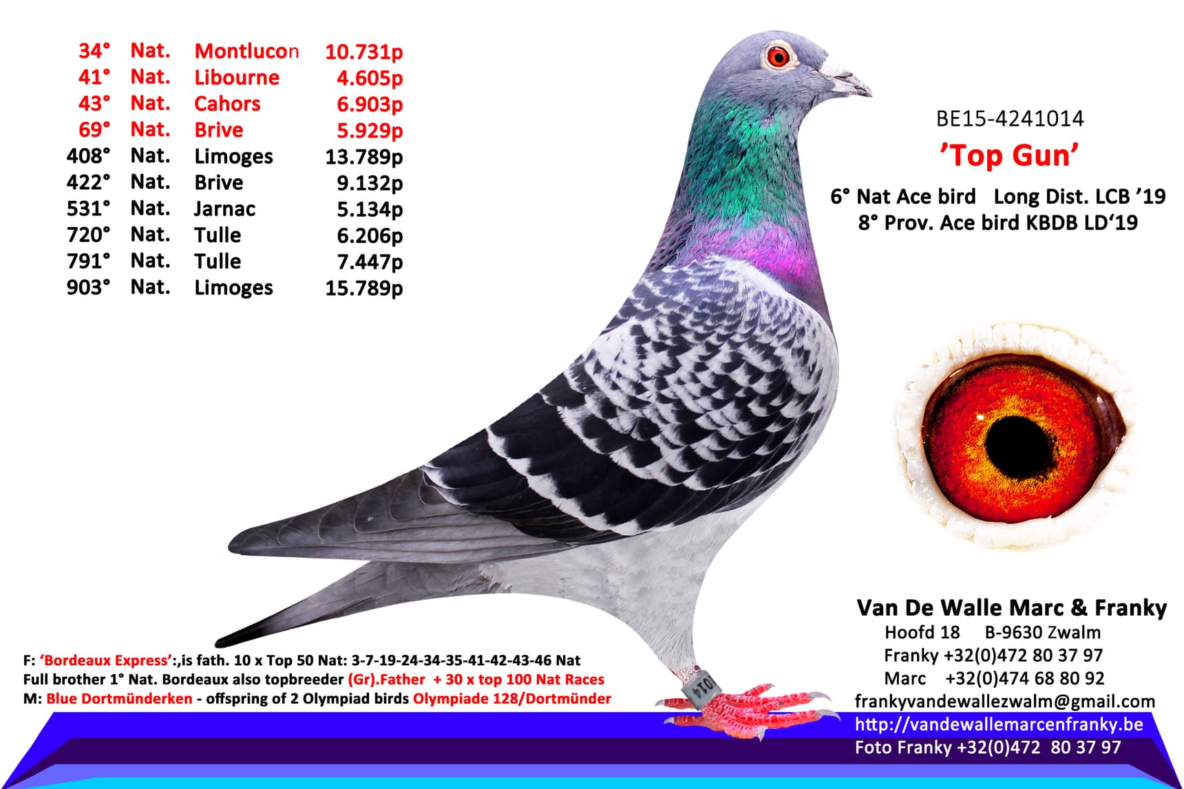 “De Libourne” 4 x TOP 50 National, 1st World Best Long Distance Pigeon KBDB 2019, 1st National Ace Pigeon Long Distance 2019 (4 KBDB flights) and 3rd National Ace Pigeon Long Distance KBDB in 2019.
