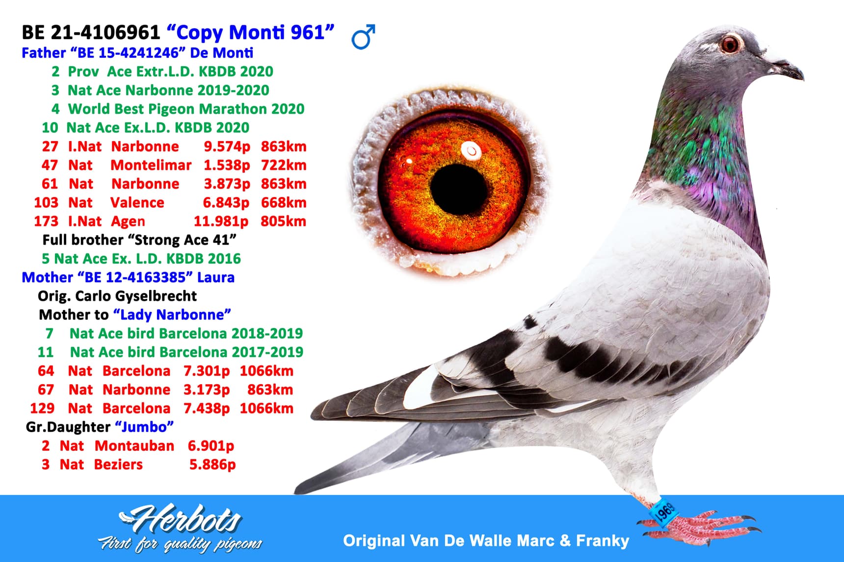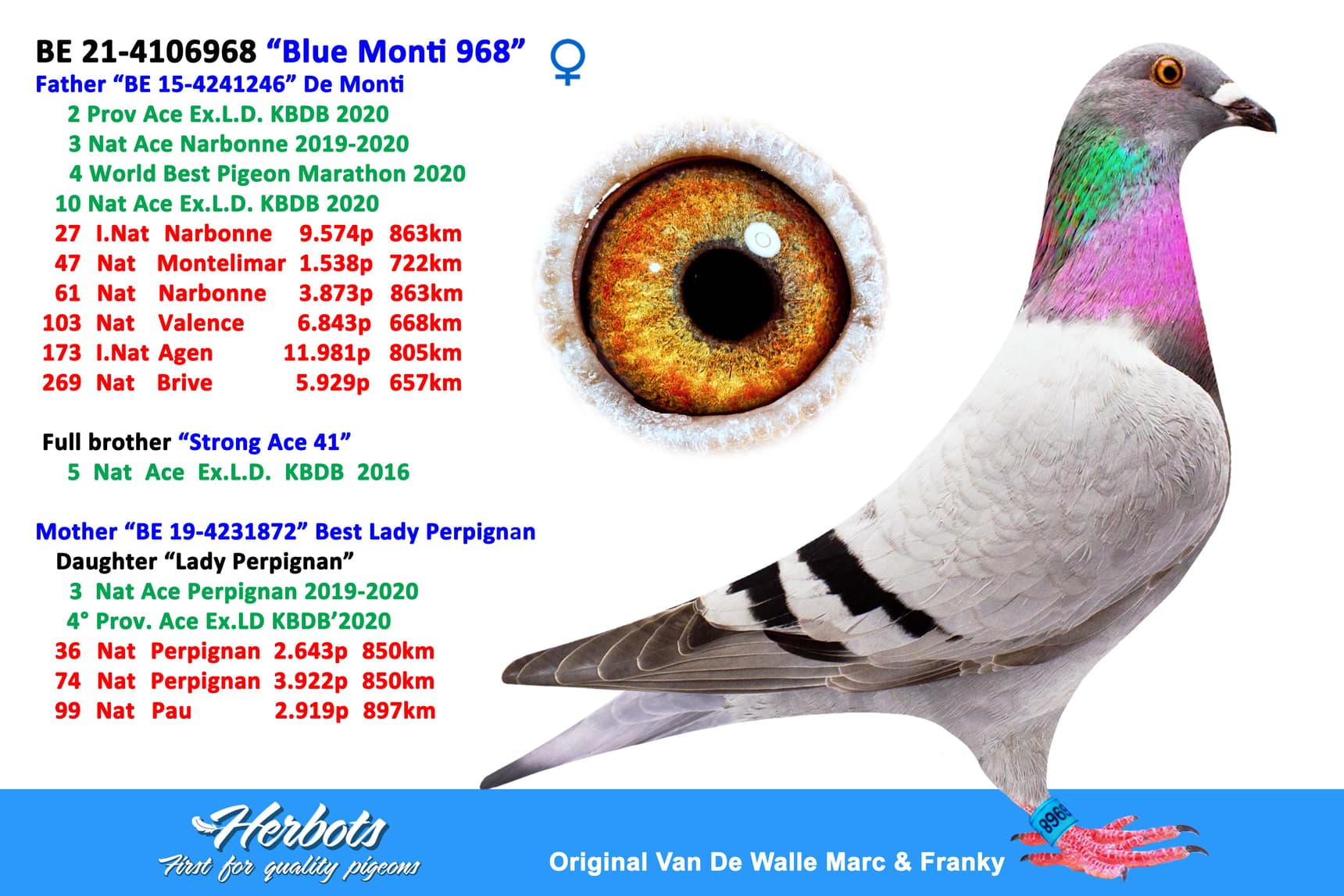 The next superstar who made the beautiful weather in Zwalm at the age of 5 years. He won 27th I.Nat Narbonne 9,574p, 47th National Montelimar 1,538p, 61st National Narbonne 3,873p and 103rd National Valence 6,843p. He became 2nd Prov Ace Pigeon Extreme Long Distance KBDB 2020, 3rd National Ace Pigeon Narbonne 2019-2020 and 4th World Best Ace Pigeon Marathon 2020.