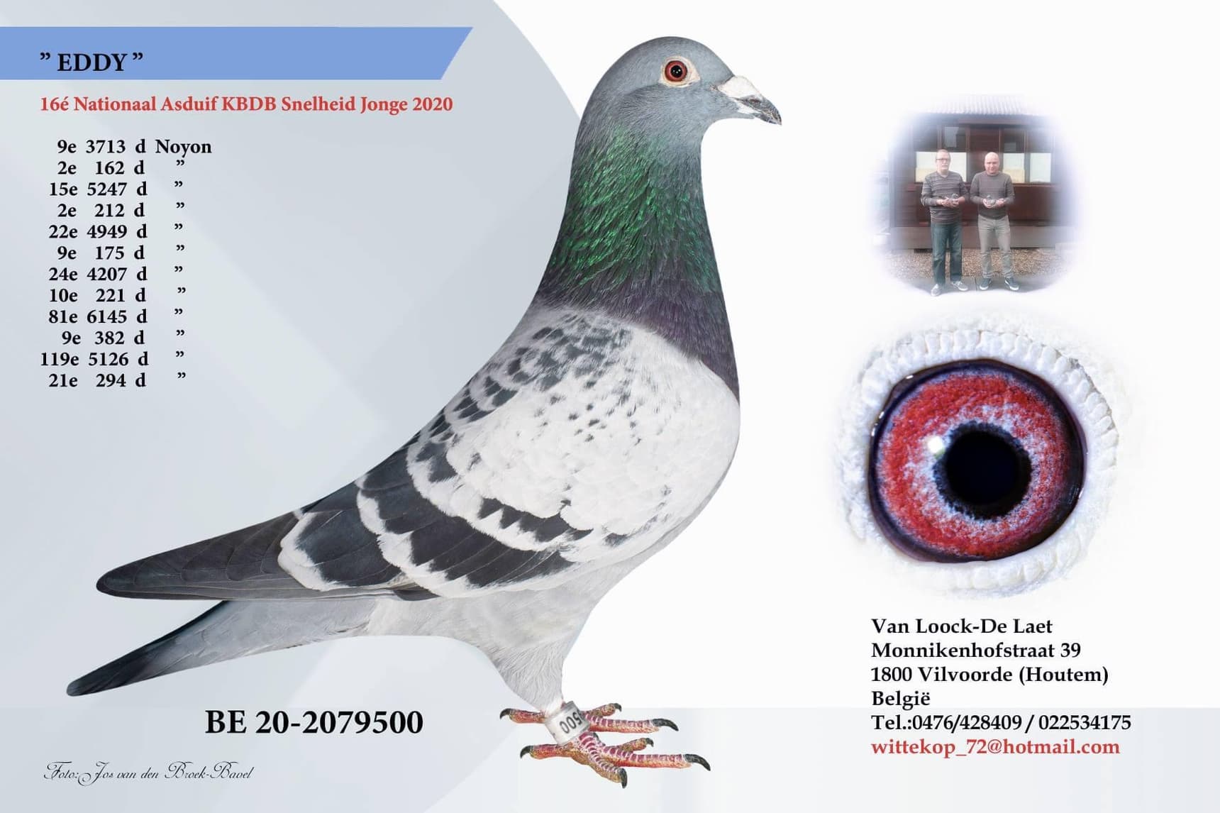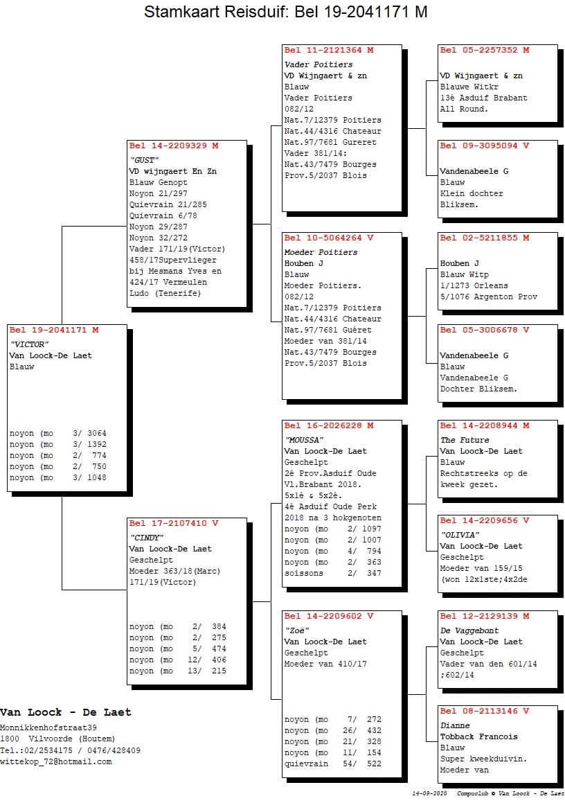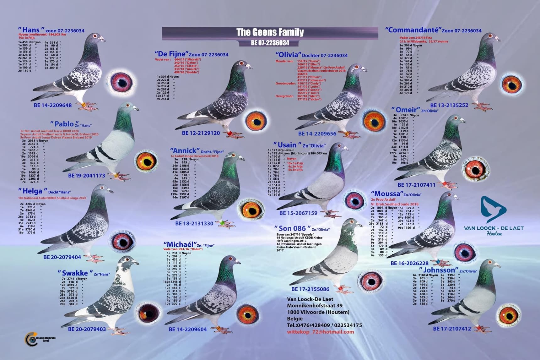 The tandem Jean De Laet and Maurice Van Loock are racing pigeons together already since 1995. The racing lofts are at Maurice's place. Especially racing on the short distance races they're doing really well here in the Hoppe region and can be found yearly amongst the national and provincial champions. The beauty about this union is that you can test your pigeons against 3000 - 4000 and even 5000 youngsters and make like this your colony stronger. The goal is now to make another loft to race the middle distance races as they won a few years ago with 'Speedy' the 1st National Ace bird middle distance KBDB year birds. In total they won 21 first pure prizes and 174x TOP 10, pure class.