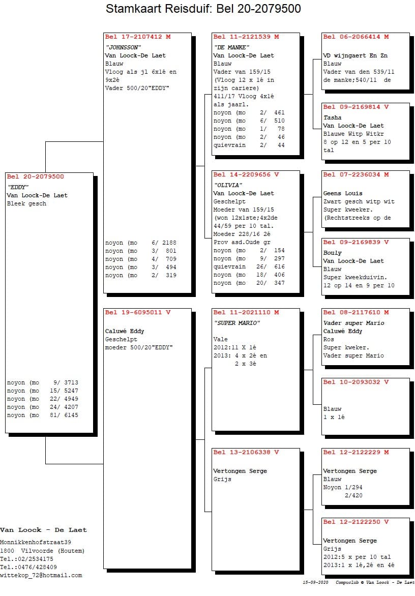 We have about 20 to 25 breeding couples with always some test couples amongst them. Our breeding base is from Geens and Salens De Boelpaep. The past few years we did really well with reinforcement from  Pierre Beyl, Eddy Caluwe, Vandenwijngaert & Zoon , Francois Tobback and Van Avondt Danny & Nick.