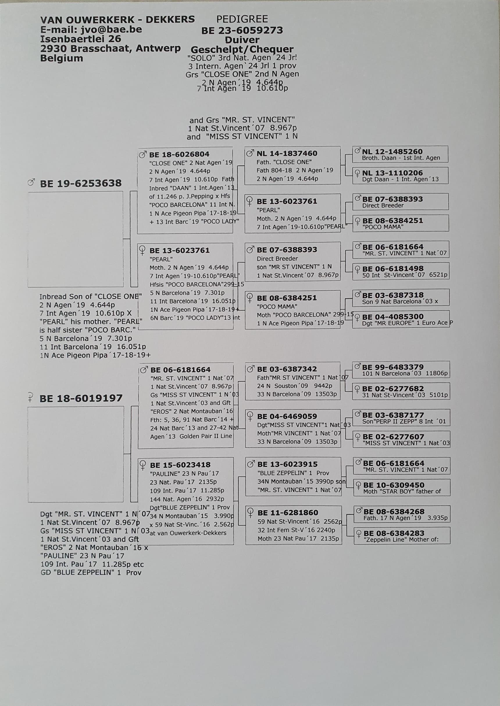 These pigeons have been crossed with proven breeding hens such as "PEARL", the half-sister of the recently stolen "POCO BARCELONA" (5th Nat. Barcelona 7,301b & 11th I.Nat. Barcelona 16,051b). Solo' is therefore an inbred pigeon, played in total widowhood, a system recommended by Jos Thoné 25 years ago and consistently followed by Jacques and his family.