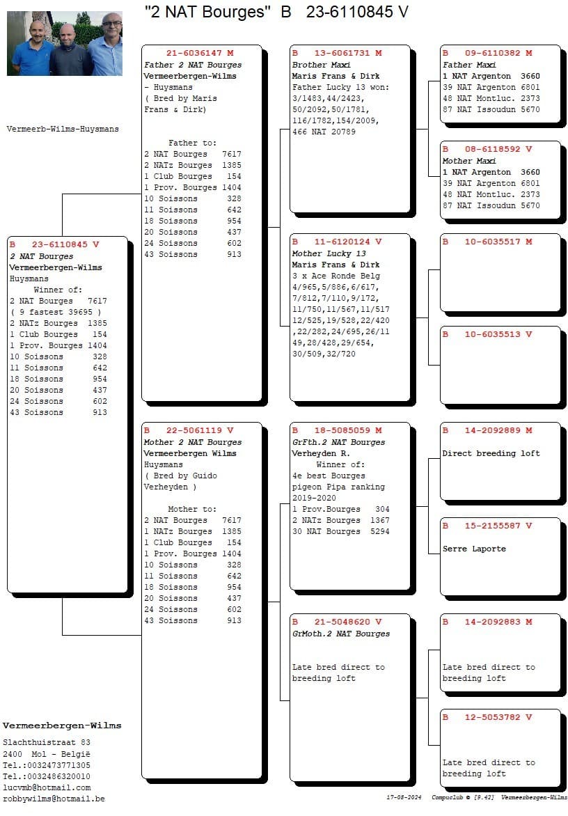 With these achievements in mind, the Vermeerbergen - Wilms - Huysmans loft is confidently looking forward to the next flight to Vierzon. The entire race team, both old and yearling pigeons, will participate. Expectations are high and the fanciers hope for a new series of brilliant results.