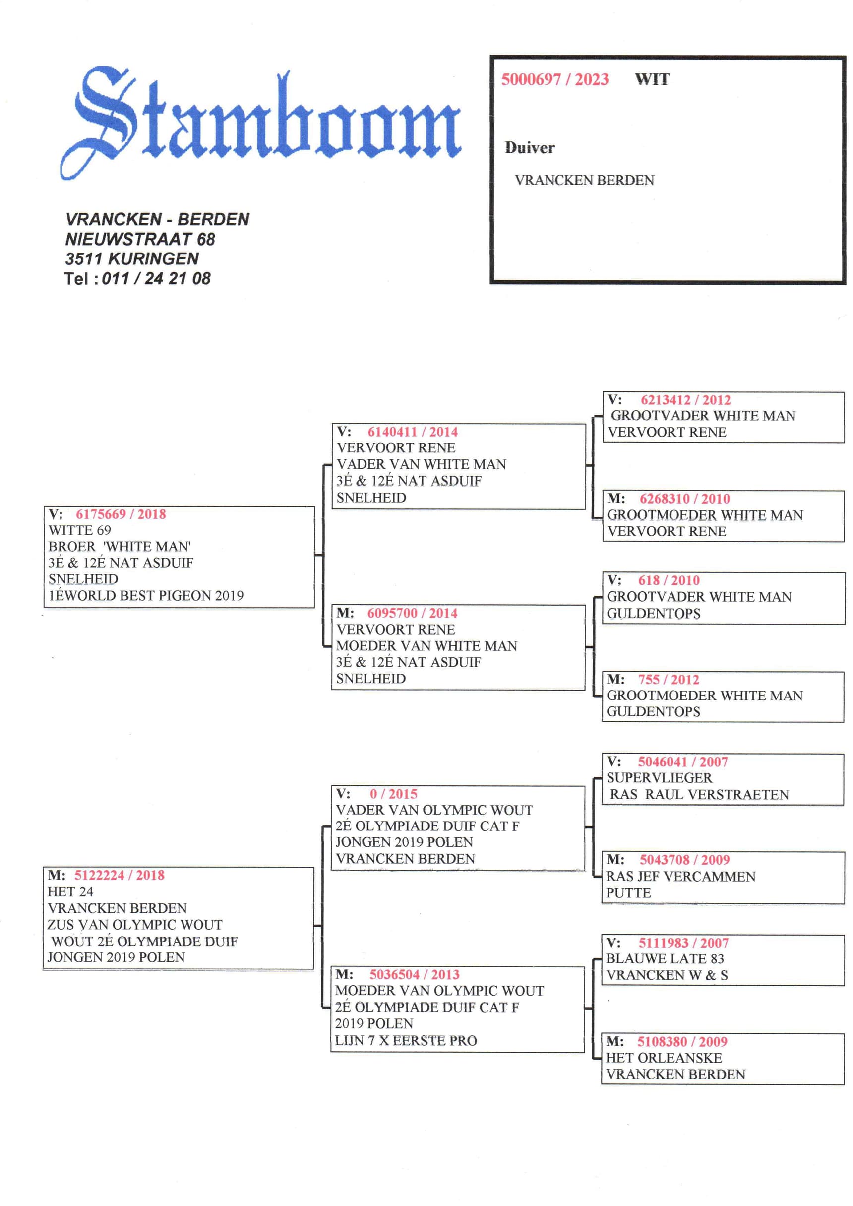 For the super colony of Vrancken – Berden, the season with the youngsters started as it ended in the 2022 season. Then he won 7th National Chateauroux against 17,081 youngsters with barely 1 pigeon in the basket. This was a grandson of “De 69” who is a full brother of White Man. These 2 brothers are true standard bearers in the colony of Vrancken – Berden and come from Rene Vervoort. Now in the 2023 season we are barely 2 games away and the victory counter of this top colony is at 2 pieces. In the first flight he won with 2 pigeons in the same second against 490 youngsters and he had to tolerate 1 pigeon for them regionally against 1,661 youngsters. The week later it was a hit and he won the first prize against 2,337 youngsters both in the combined game and regionally and he set up a nice series 2x. This time the winner is a white young cock who is a direct son of "De 69". Where this blood is in you simply breed winners….