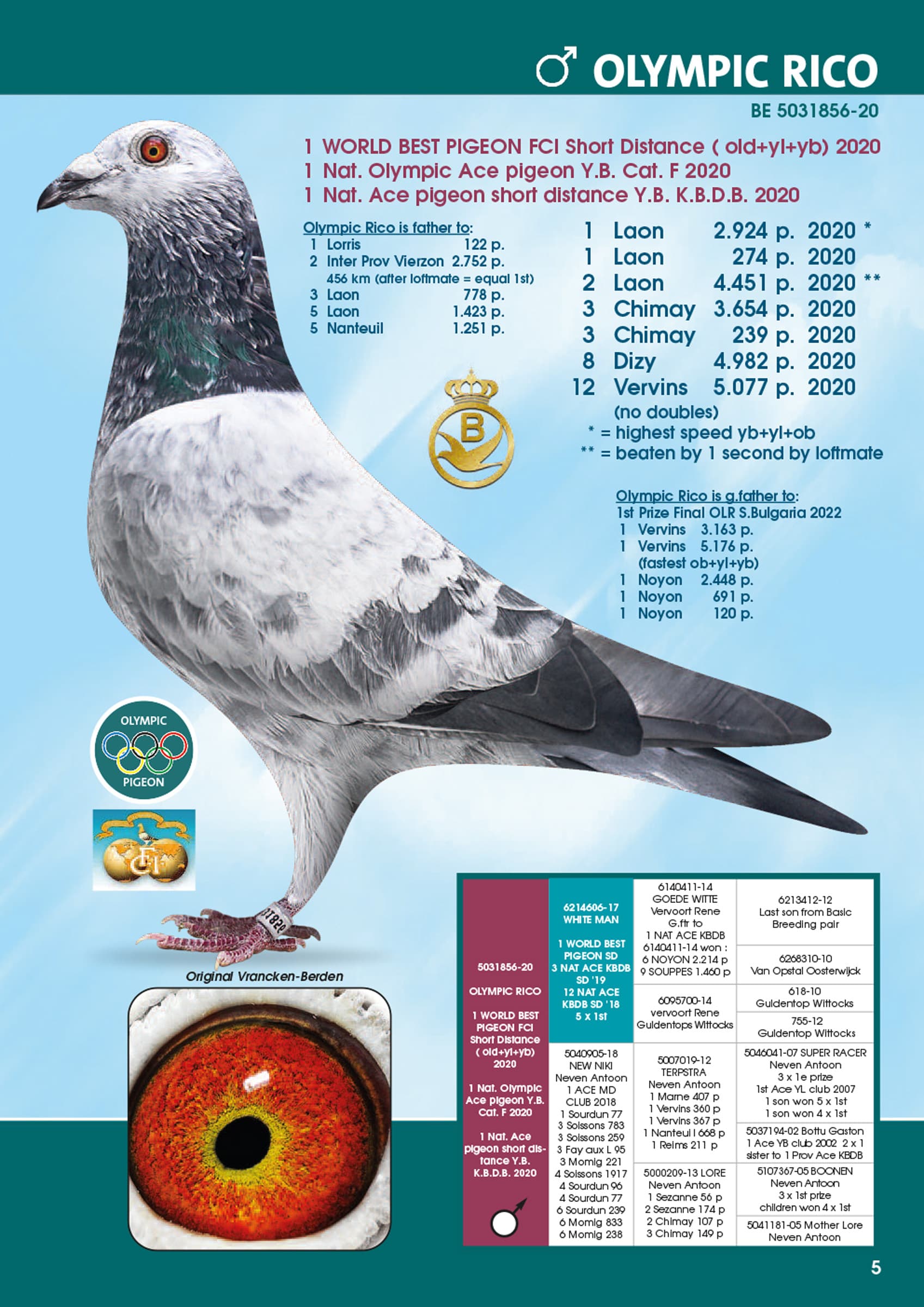 Father of "Olympic Rico" 1st National Ace Pigeon Sprint KBDB 2020 , 1st Nat Olympiad Pigeon Olympic Hope Cat.F KBDB 2020 and World's Best Ace Pigeon FCI Sprint (olds - yearlings and youngsters together) 2020.