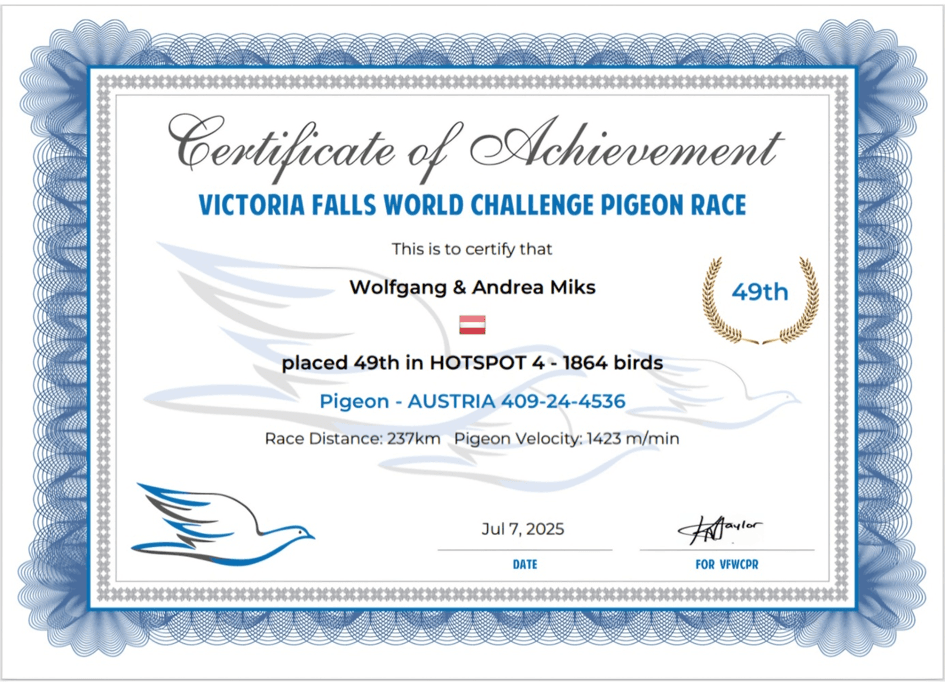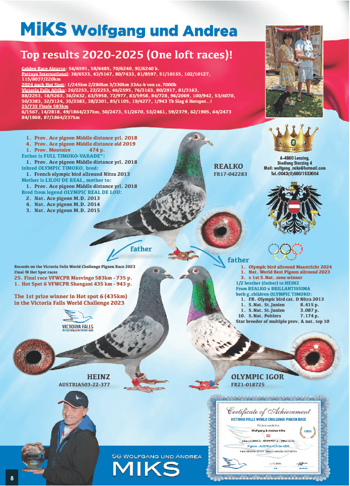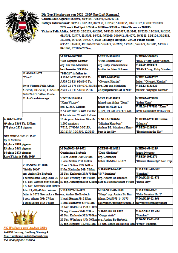 Austria — A love for pigeons, a tight team, and results that keep coming. For Wolfgang & Andrea Miks, the formula is simple: smart selection, calm execution, and pigeons that clock early.