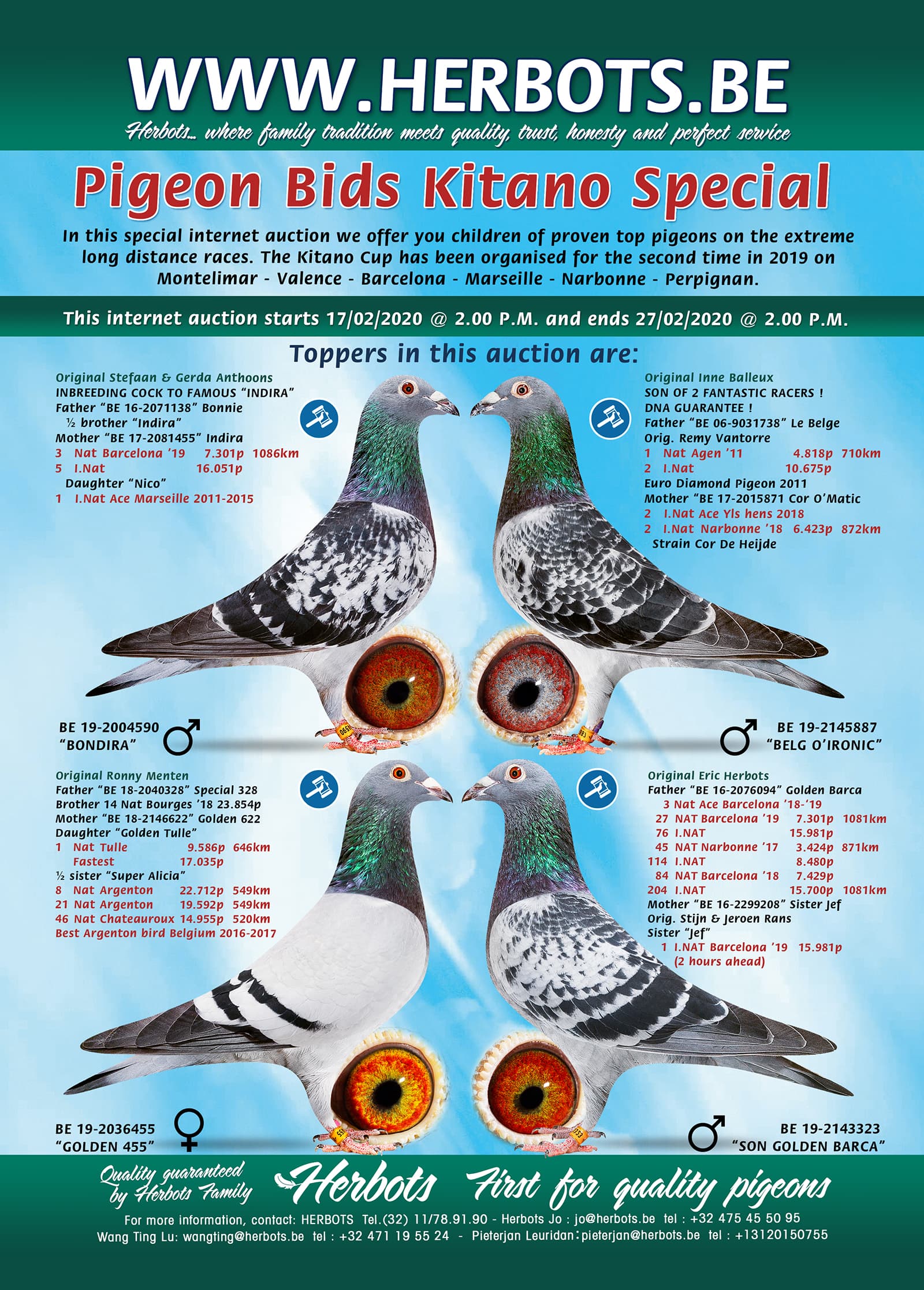 In this special internet auction we offer you children of proven top pigeons on the extreme long distance races. The Kitano Cup has been organised for the second time in 2019 on Montelimar - Valence - Barcelona - Marseille - Narbonne - Perpignan.