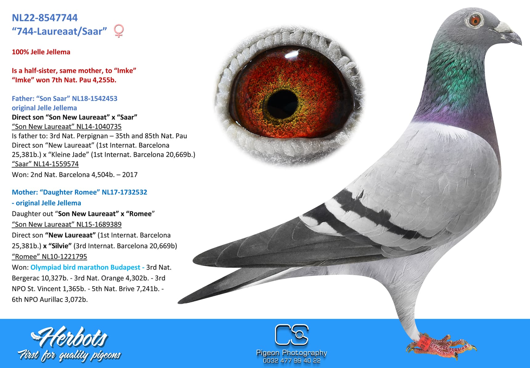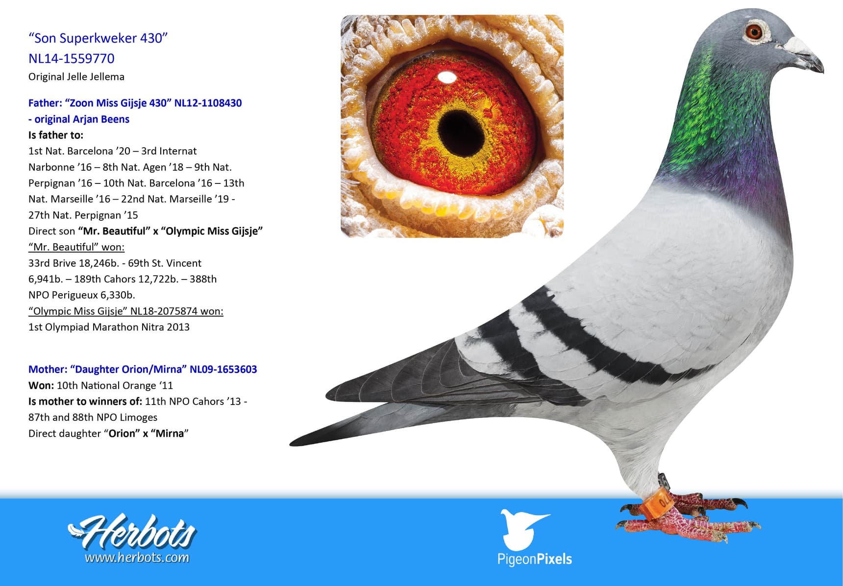 Direct son “Son Miss Gijsje 430” (Is father to winners of 1st Nat. Barcelona ’20 – 3rd Internat Narbonne ’16 – 8th Nat. Agen ’18 – 9th Nat. Perpignan ’16 – 10th Nat. Barcelona ’16 – 13th Nat. Marseille ’16 – 22nd Nat. Marseille ’19 - 27th Nat. Perpignan ’15) x “Daughter Orion”(won 10th Nat. Orange)