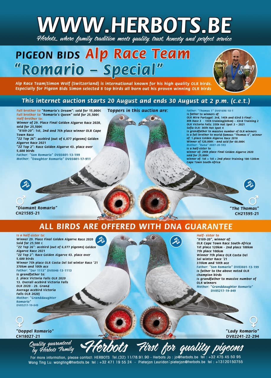 Alp Race Team/Simon Wolf (Switzerland) is international known for his high quality OLR birds. Especially for Pigeon Bids Simon selected 8 top birds all born out his proven winning OLR birds