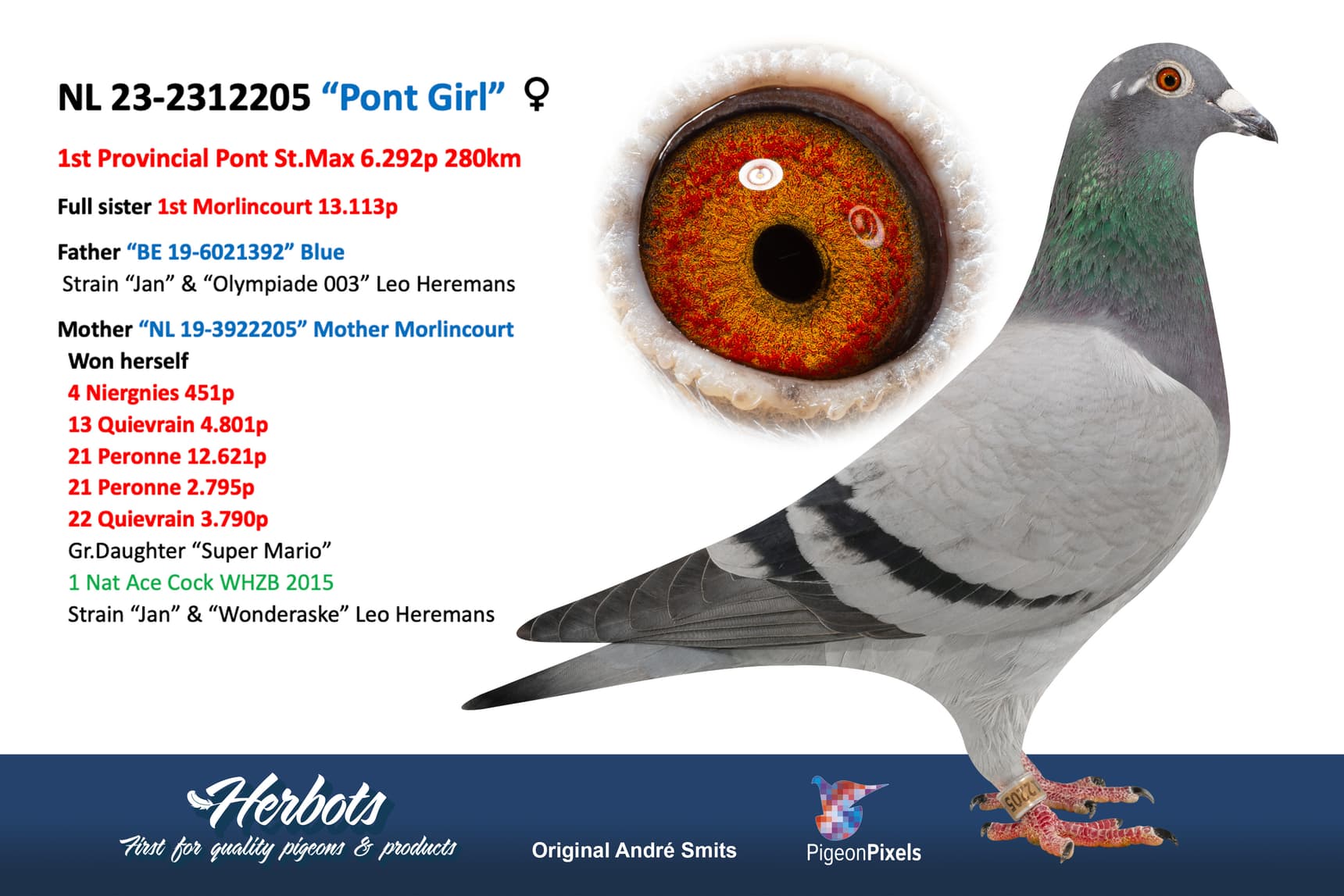 The first is “Mister Niergnies” won 1st Prov.Niergnies against 13,651 young pigeons and the second is “Pont Girl”. She won 1st Prov Pont.St.Max 6,292 young pigeons.