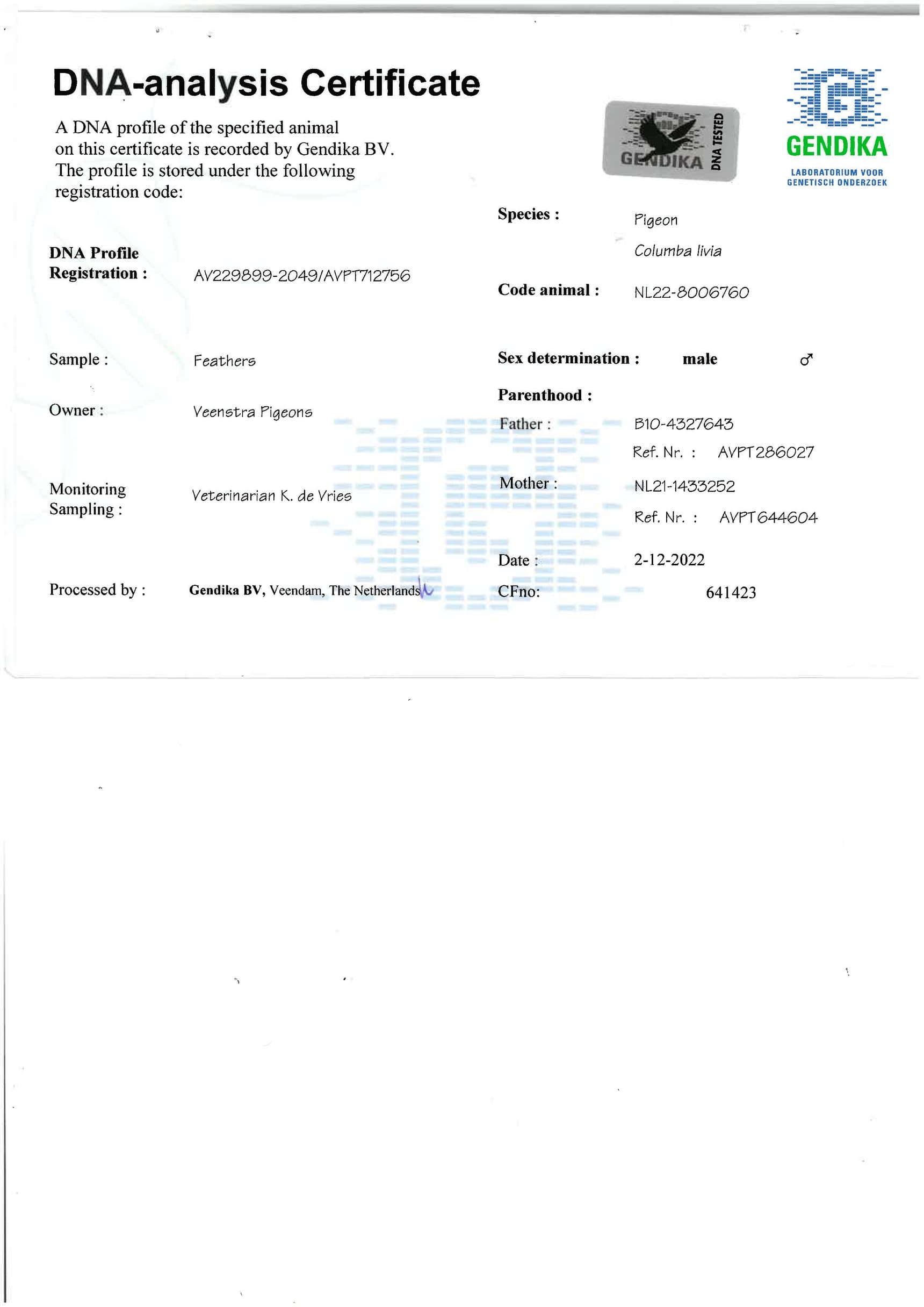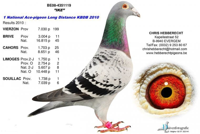 Born out “Ike” (1st Nat. ace KBDB Fond 2010) x “Sister Champion” (top breeding hen)
