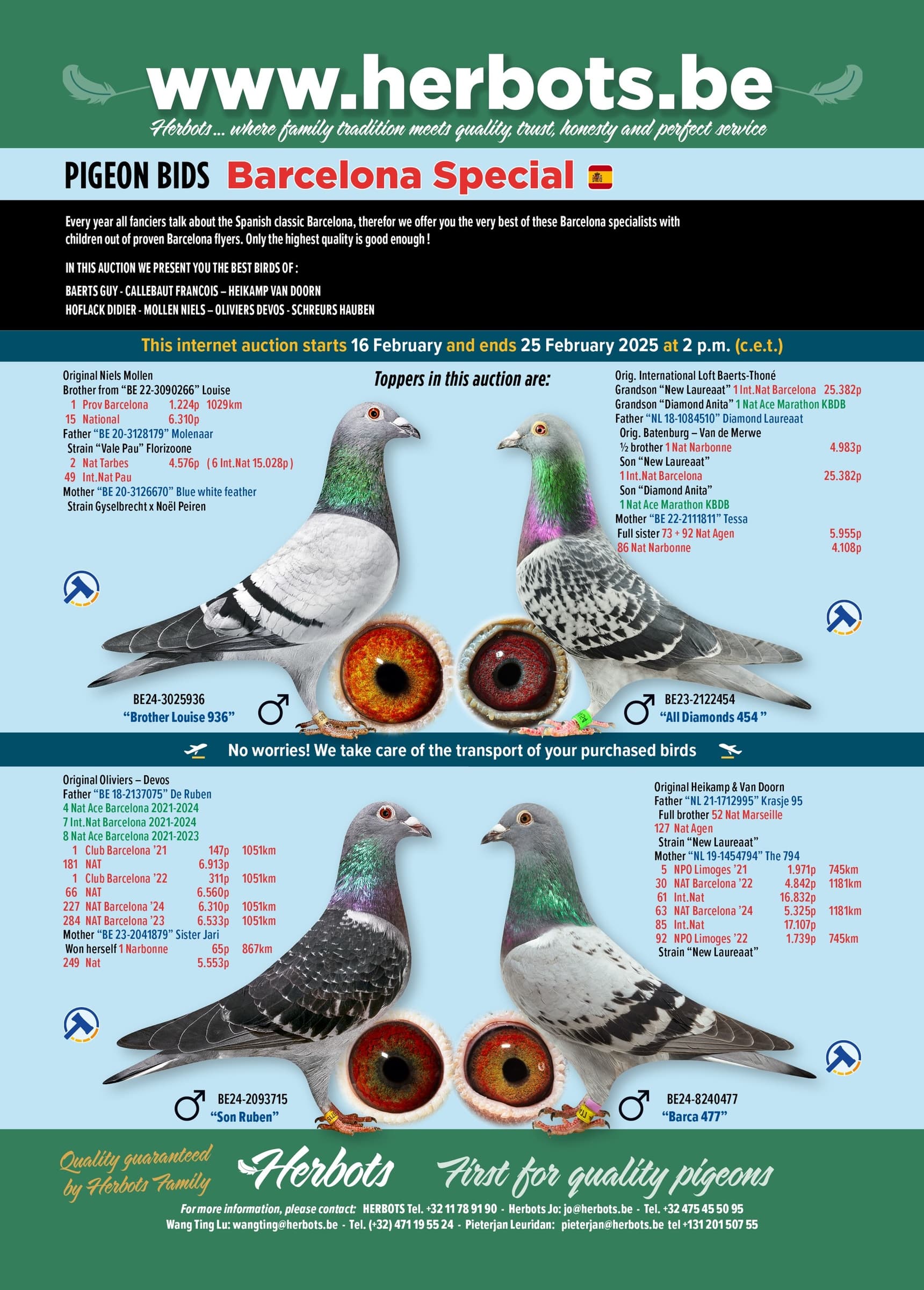 Every year all fanciers talk about the Spanish classic Barcelona, therefor we offer you the very best of these Barcelona specialists with children out of proven Barcelona flyers. Only the highest quality is good enough !